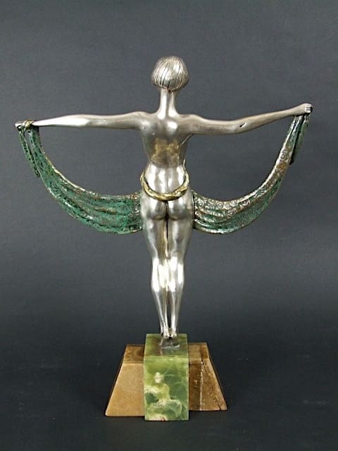 Silvered bronze dancer with dinanderie scarf detail. Mounted on a green and brown onyx pyramid base. An unsigned piece from the Etling foundry but I believe possibly by Pierre Le Faguays.
