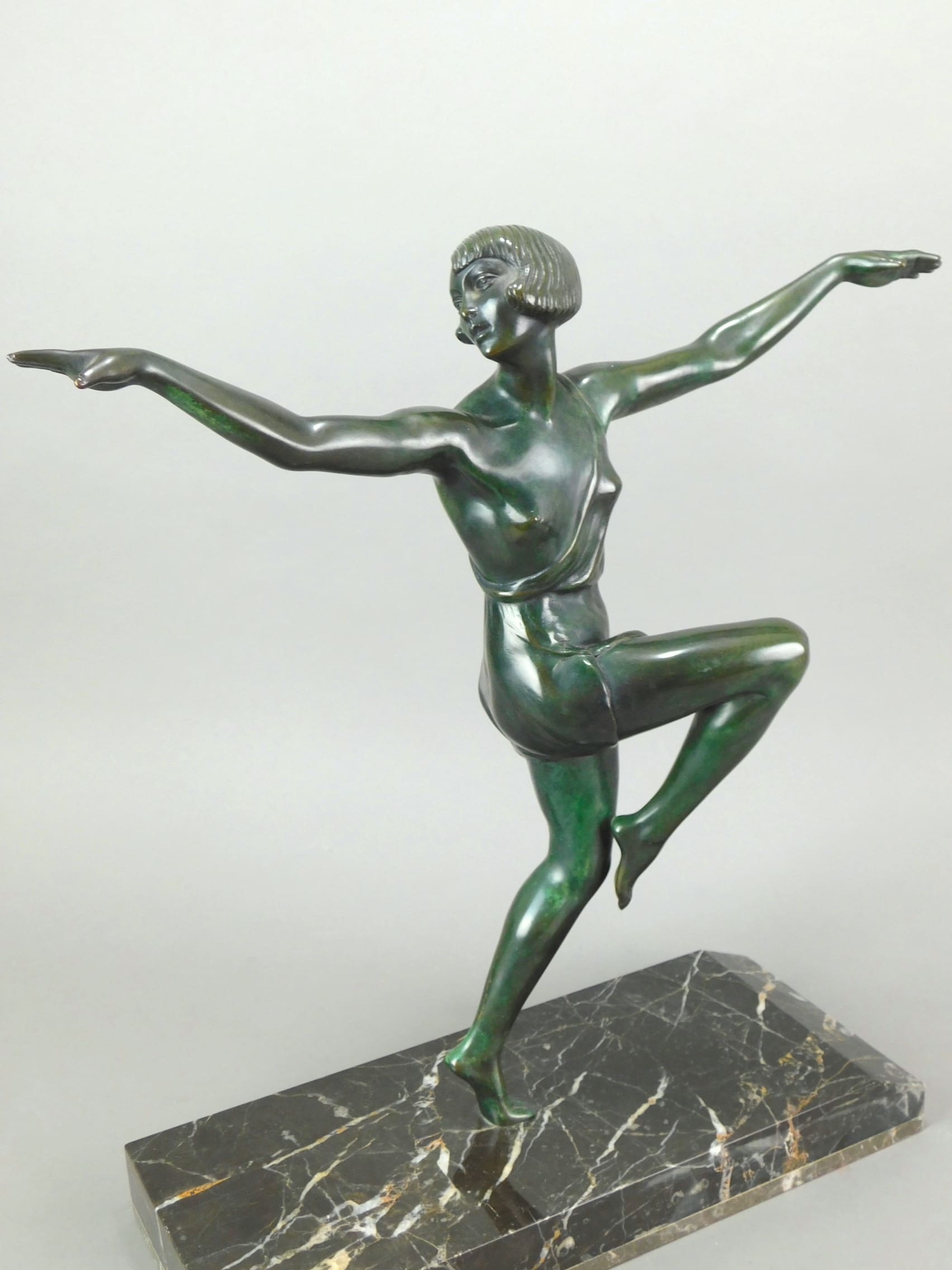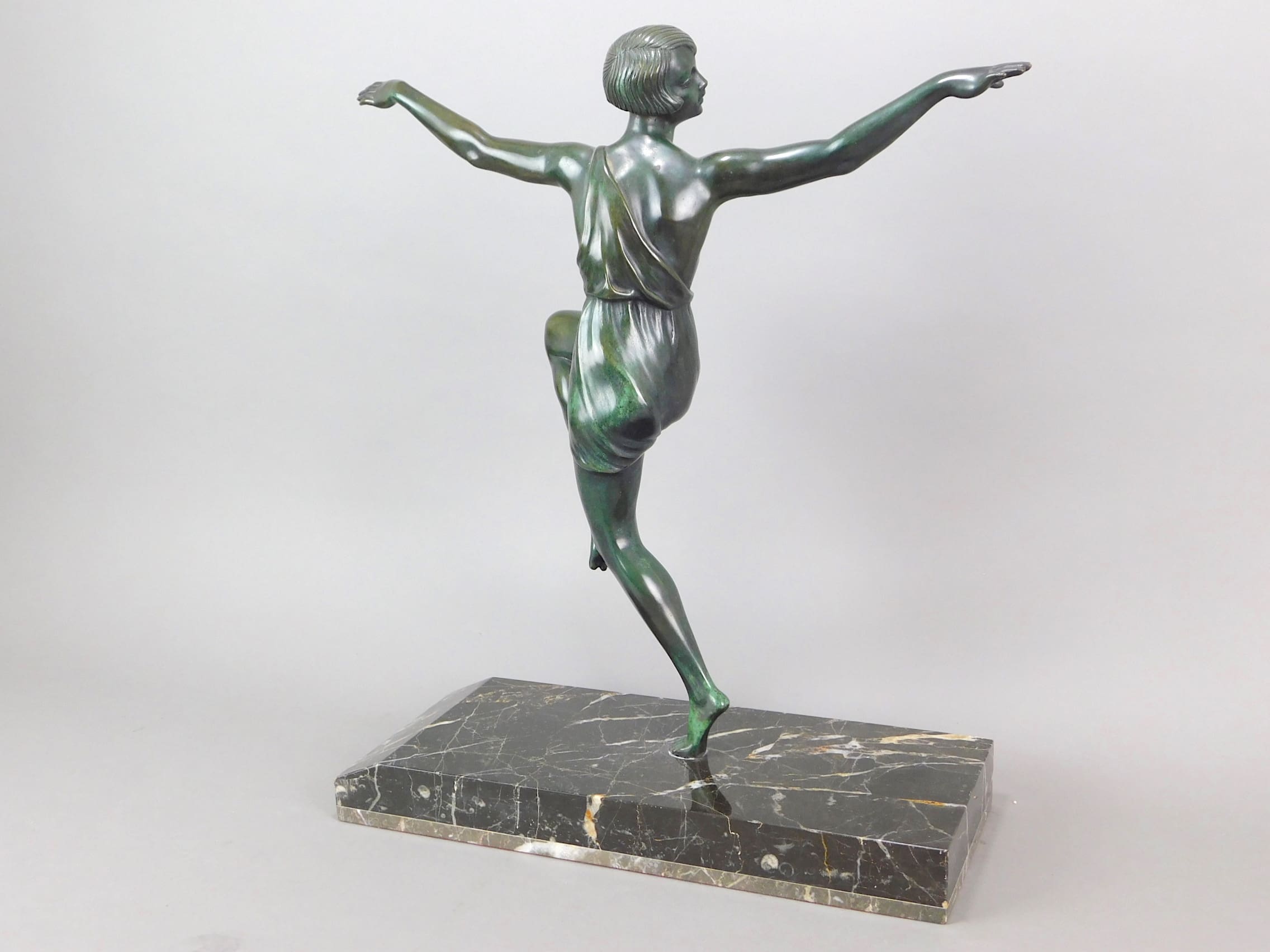 French green patinated art deco bronze dancing couple. Unsigned but definitely by Pierre Le Faguays. These statues were sold when new with an option for a pair on one single base or as single pieces. It is unusual to get a pair which are each on their own bases.