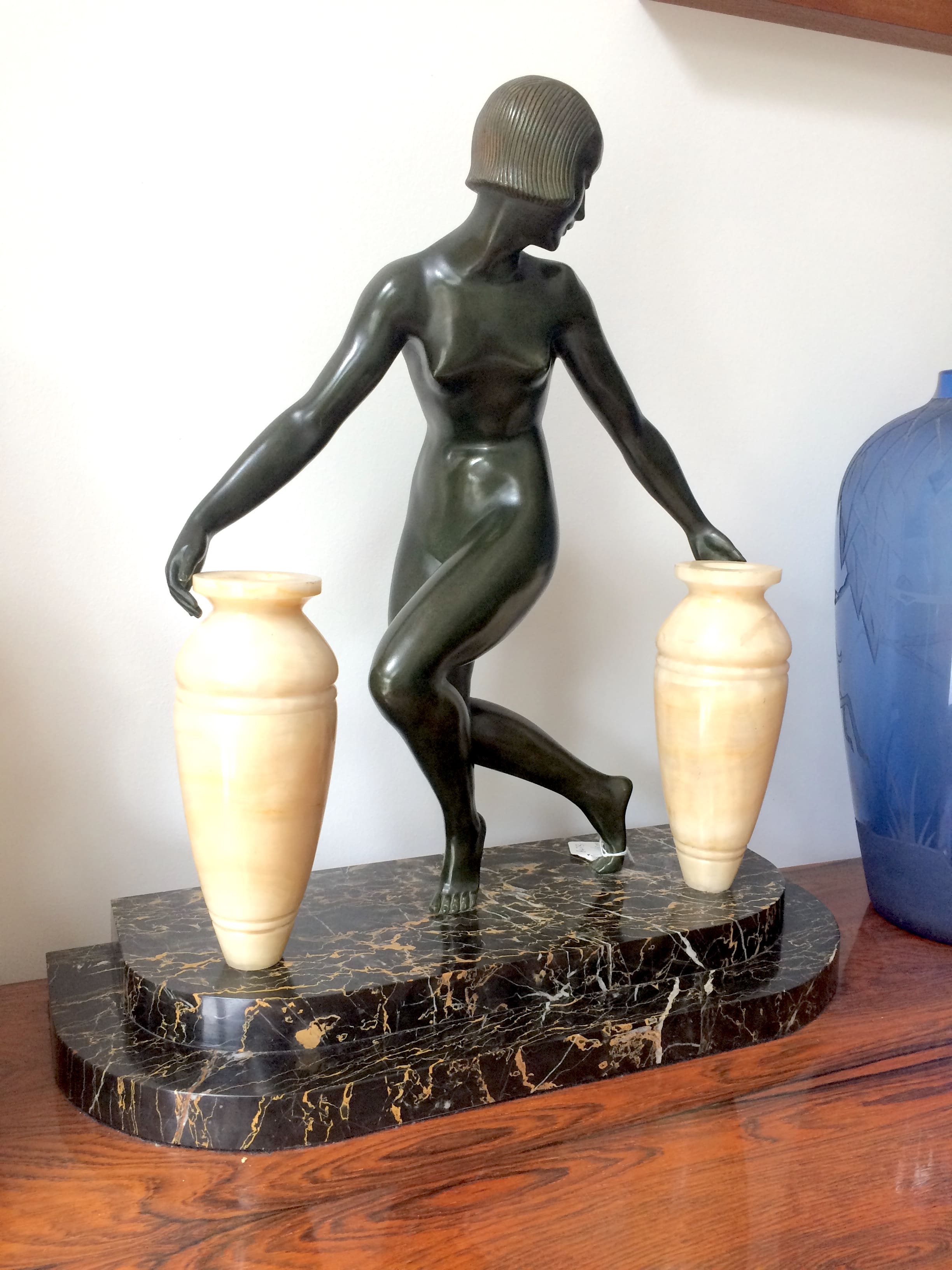 Large French art deco bronze girl with a pair of alabaster water urns as lamps. Portorro marble base, signed Le Faguays. Tops of urns remove for bulb replacement.