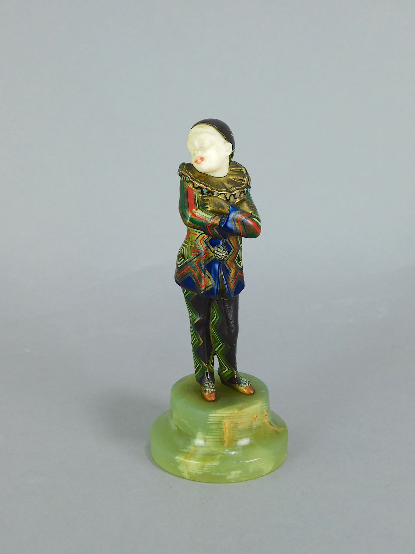Chryselaphantine Pierrot Boy. An Austrian (Viennese) art deco bronze and ivory pierrot statue by Peter TERESZCZUK – unsigned. An earlier version of this statue was made in 1910 and this is the updated version made in 1925.