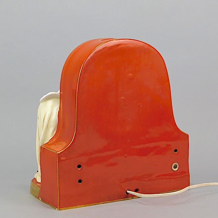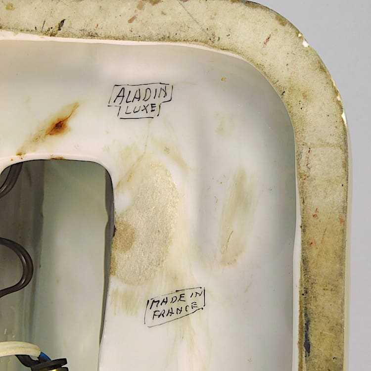 A large French ceramic nightlight of a Pierrot, signed under the base Aladin Luxe and Made in France. Beautifully hand painted and with its original bulb holder which lights up the pierrot and the window behind.