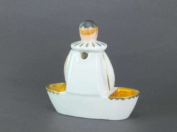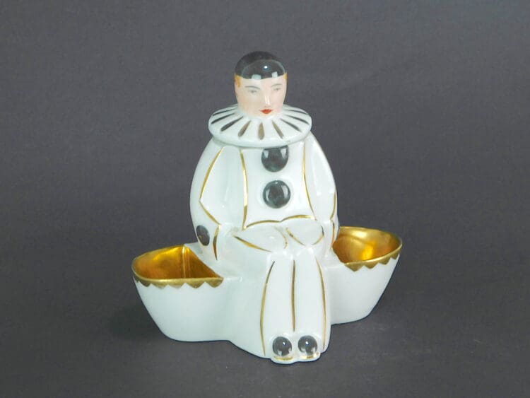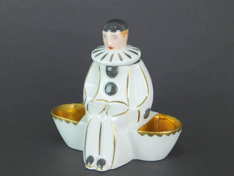 Wonderful French ceramic 3 section condiment set. Central Pierrotte mustard pot is flanked by a salt and a pepper dish with gilt lining. Very much in the style of Robj but this one unmarked. His head removes to reveal mustard pot.