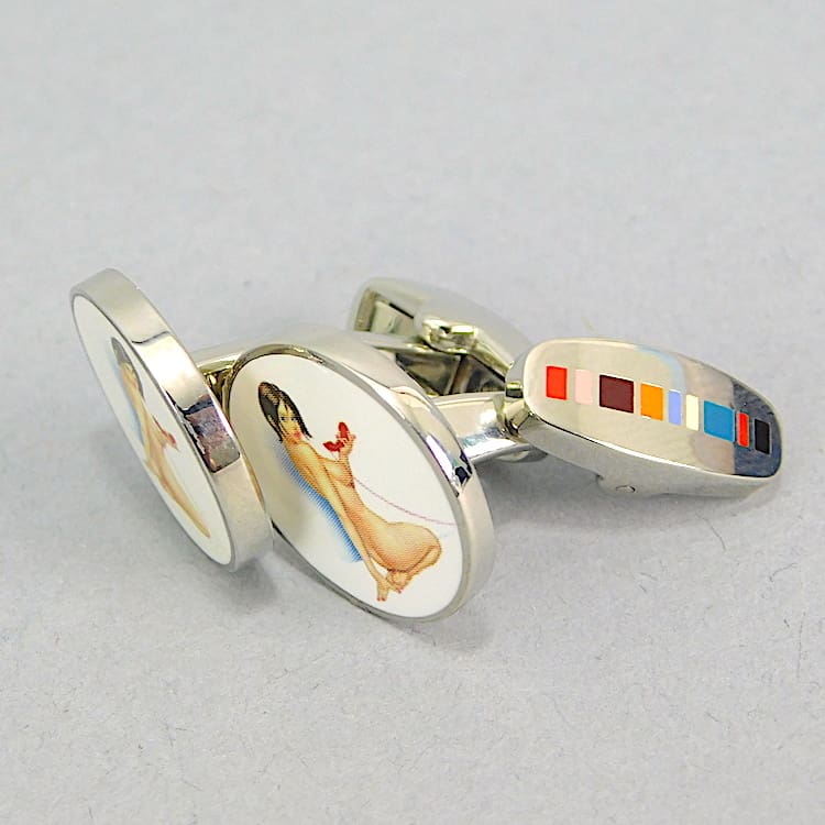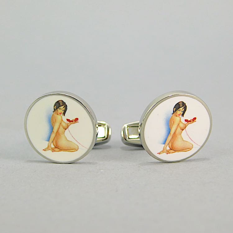 Mans saucy Varga girl holding a telephone pin up cufflinks.