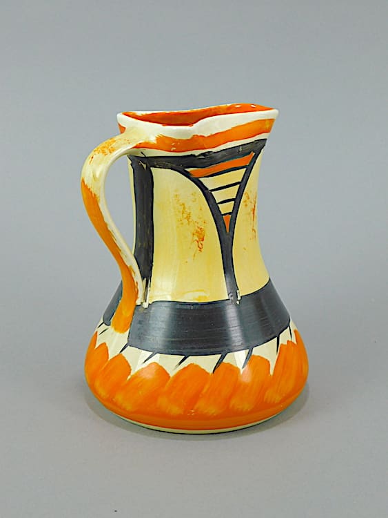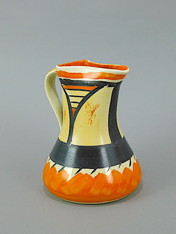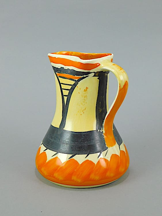 Ceramic jug with hand painted design in orange, yellow and black and marked to the base Myott and Son, Made in England.