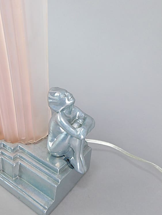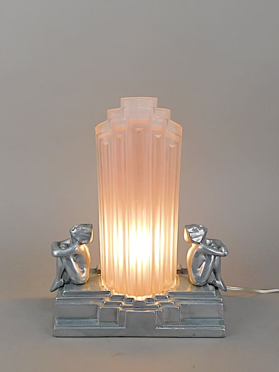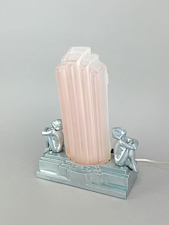 An odillon style pink tinted shade between a pair of stylised pixie girl, mounted on a stepped base.