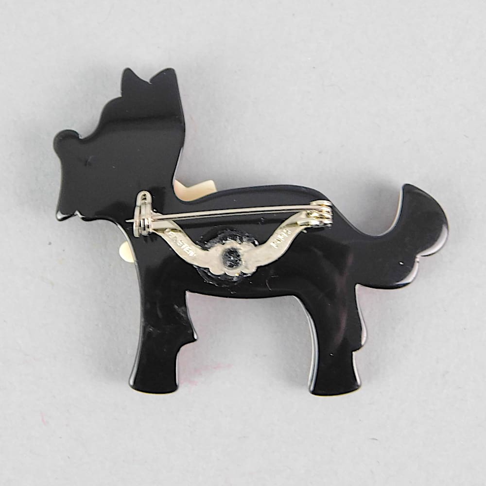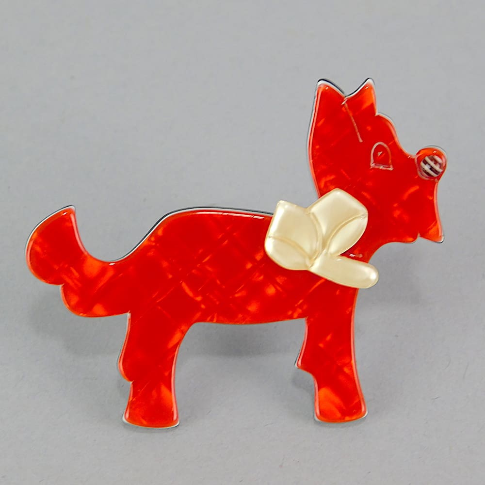 This dog is Ploukie, he is an early Lea Stein brooch, a first edition piece made between 1968 – 1980. Signed on the V clasp.