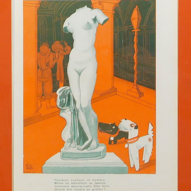 An original French art deco Fantasio magazine printed page of Ric and Rac the naughty terriers by Pol Rab. Ric says to Rac – she may be beautiful but how does she scratch herself. Marked Rome 28.