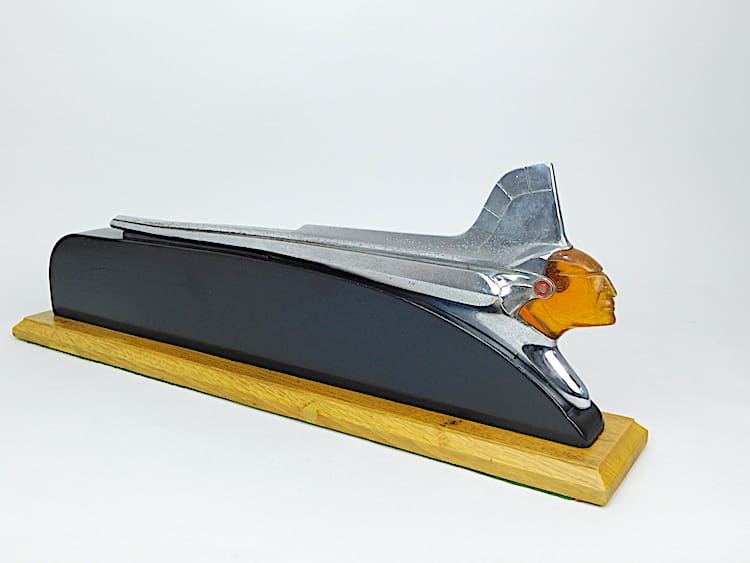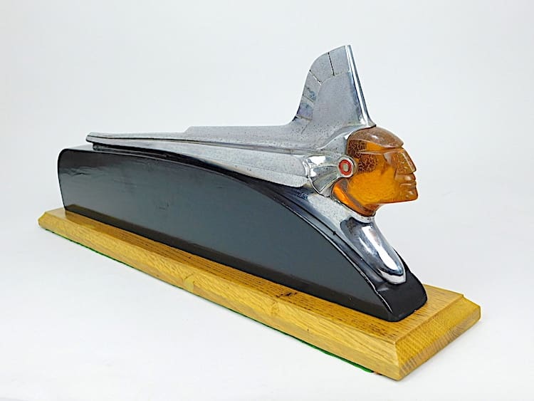 Original American art deco Pontiac Chieftain Car Mascot (hood ornament). This is the punk model dating to 1953. Mounted on a hand carved wooden base.