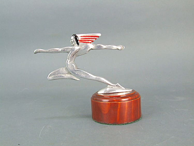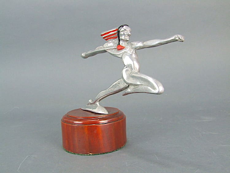 American art deco Indian Chief car mascot. Dating to the early 1930s and made of aluminium. Mounted on a wooden base.
