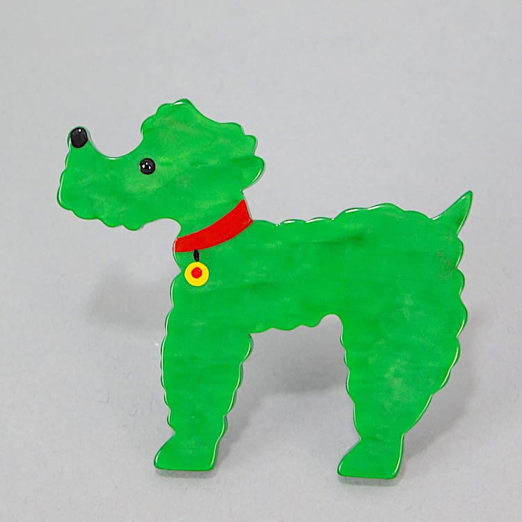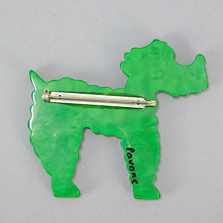 Vintage French galalith hand painted poodle brooch. Signed to the back Pavone and fitted with a roll safety clasp.