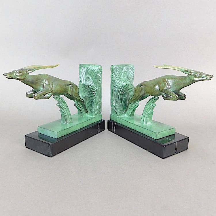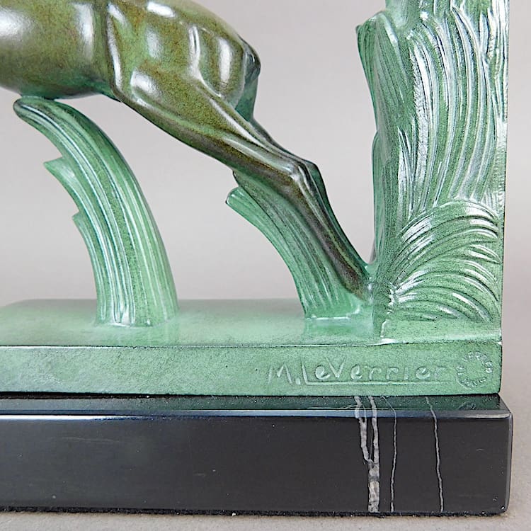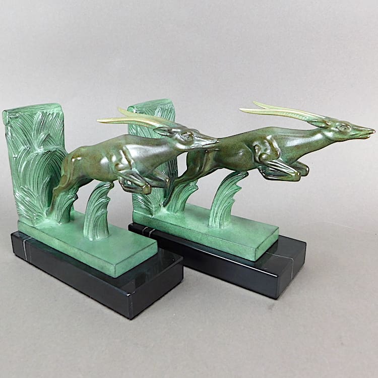 French art deco green patinated leaping deer bookends known as Poursuite.