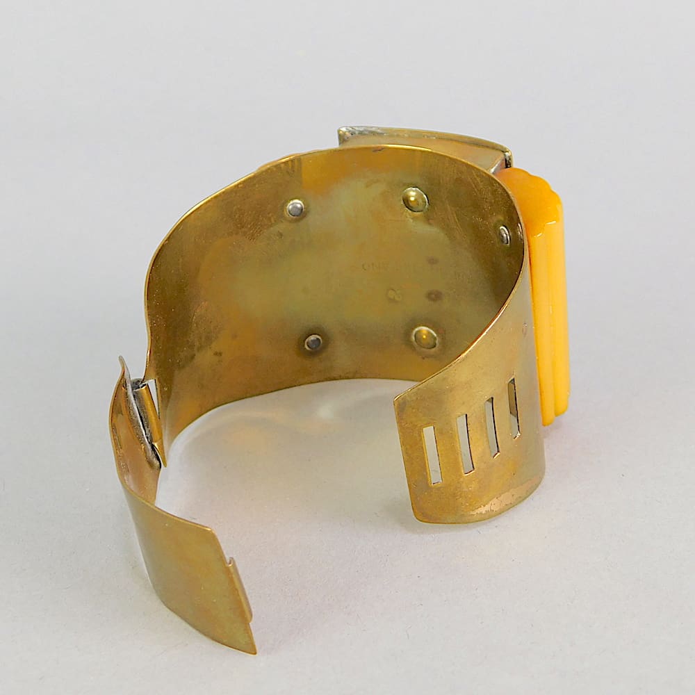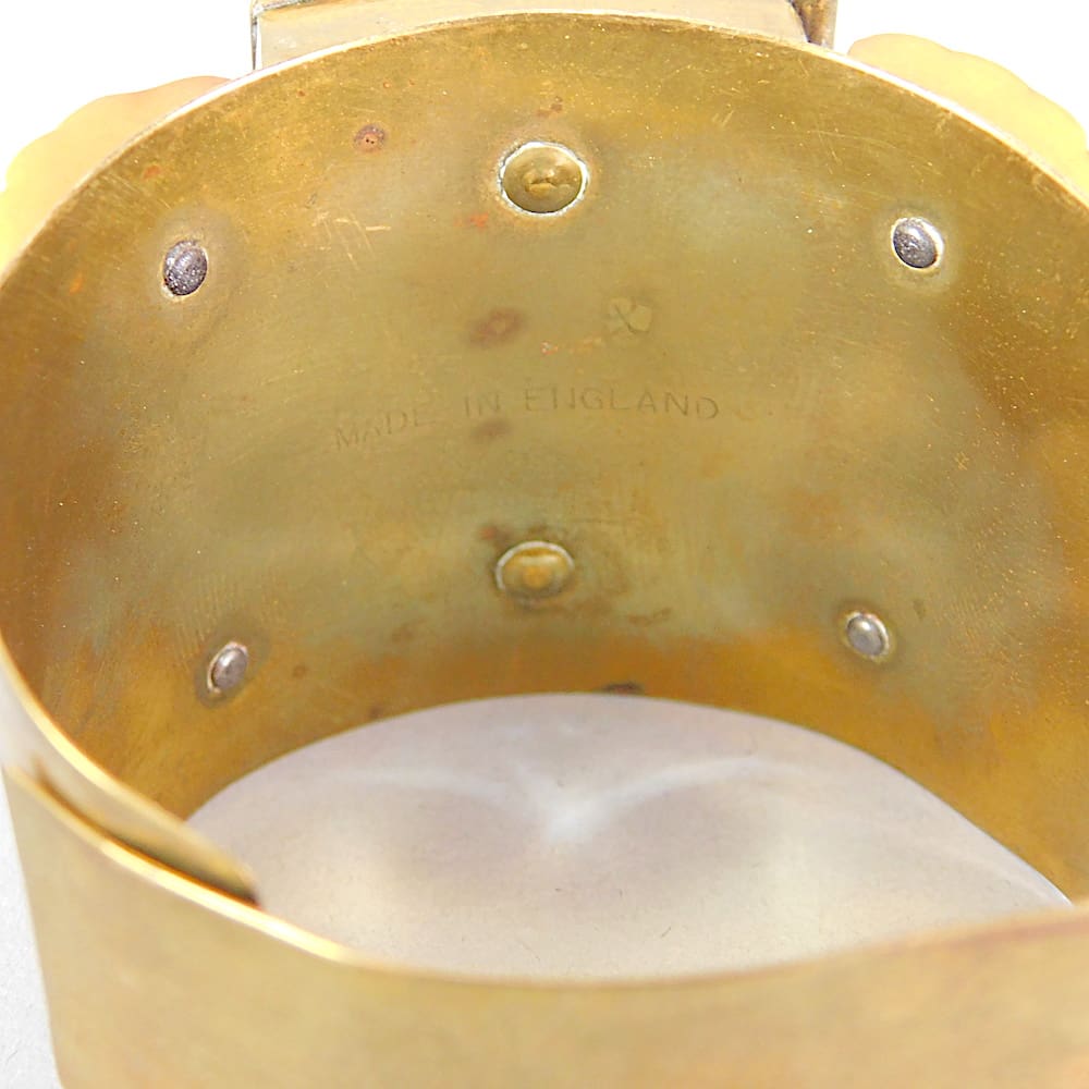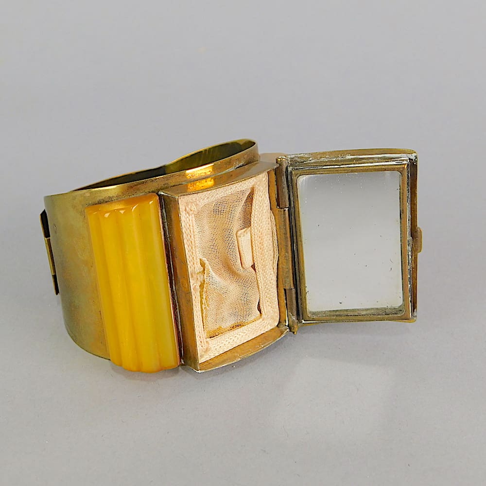 These powder compact bangles are now getting very hard to find. This one is English and has Carvacraft type panels of amber phenolic material to the front. To the centre panel is a lift up lid and inside is a powder mesh and mirror to the lid.