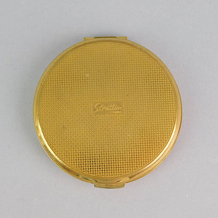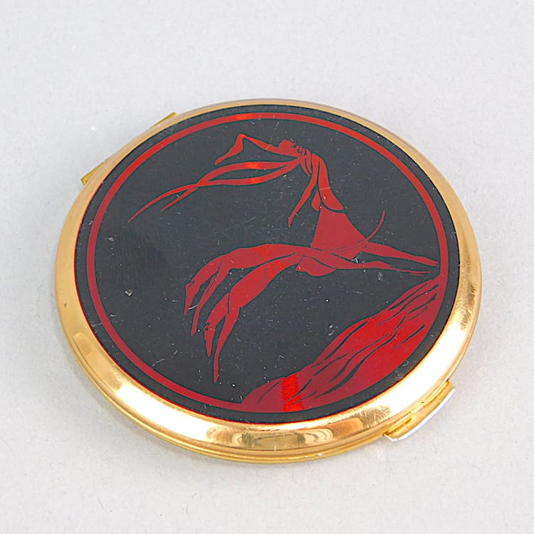 Bright red and black phenolic panel flapper and dog powder compact. Inside is empty except for a mirror in the lid. Marked Stratton to the base.