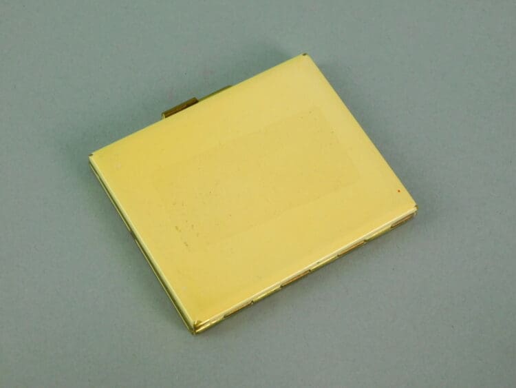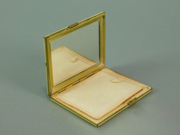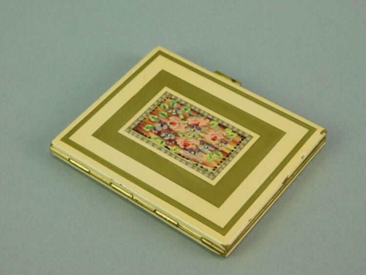 Cream enamel and guilt floral compact. It measures 2.75 inches by 2.25 (7cm x 5.5). Inside is a mesh and puff and a mirror.