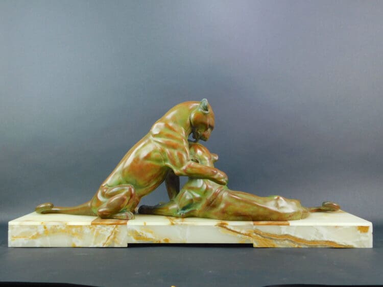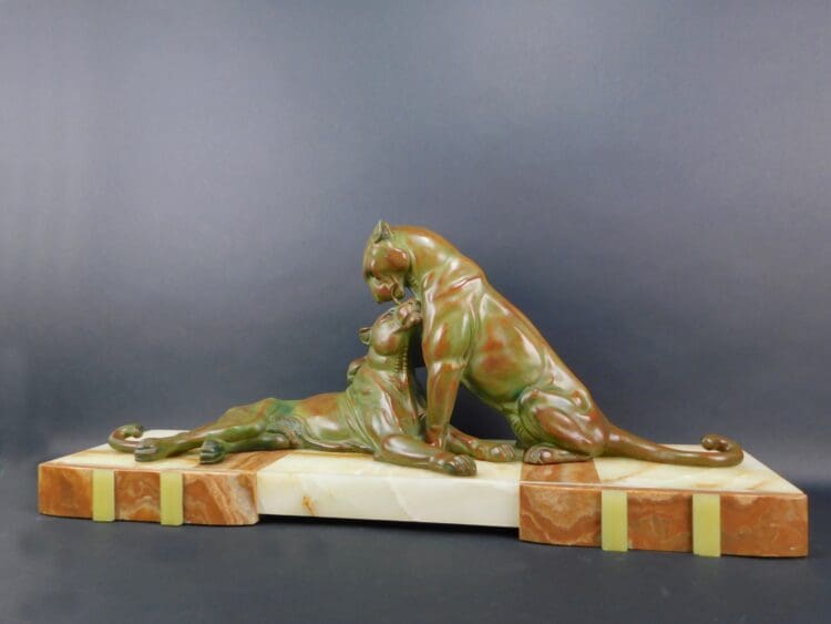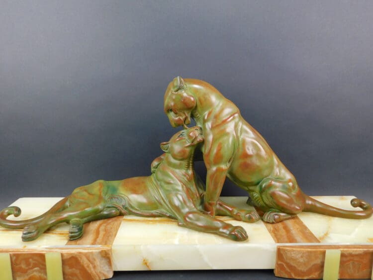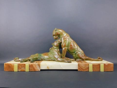 Huge French art deco spelter figural group of preening panthers. Unsigned but possible by Becquerel. It has an indistinct marking to the leg which may be a signature.