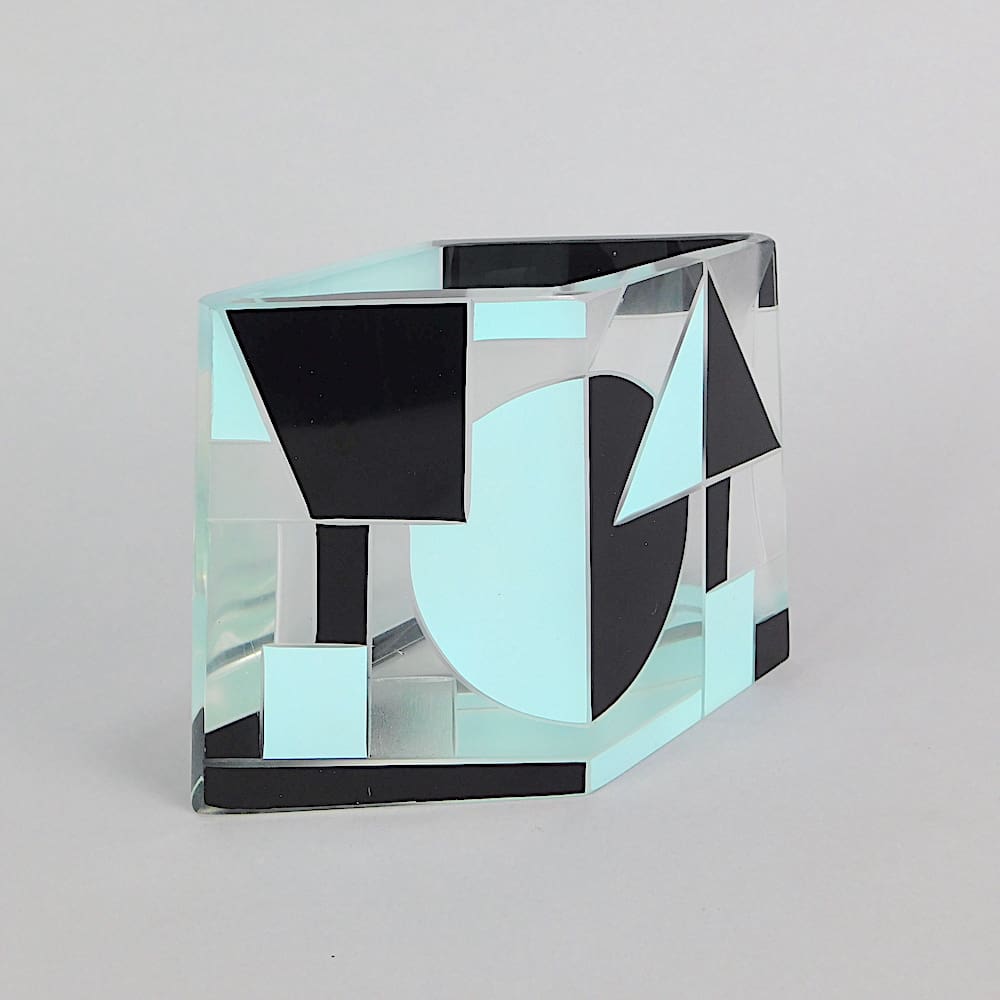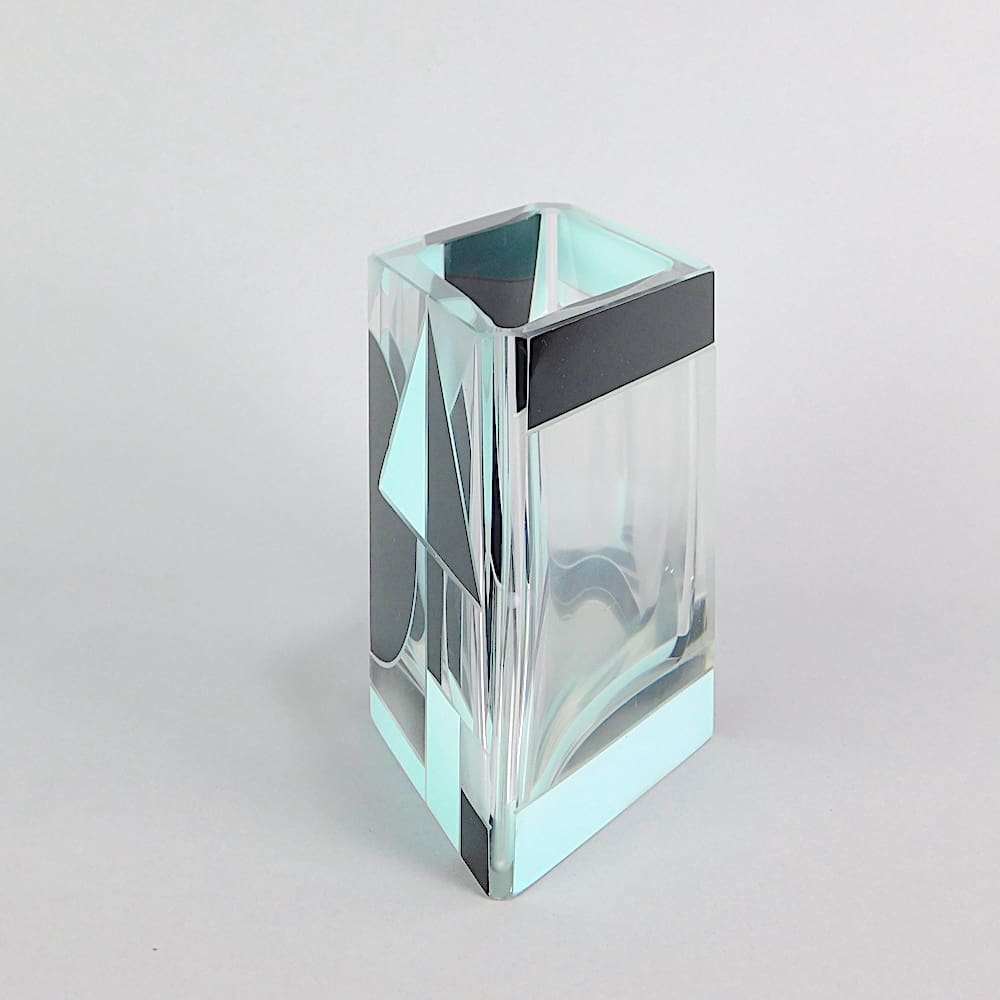 Czech leaded glass vase. Geometric patterning in an unusual turquoise and black enamelling in an art deco design. Unsigned but attributed to Karel Palda.