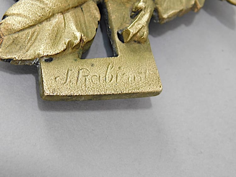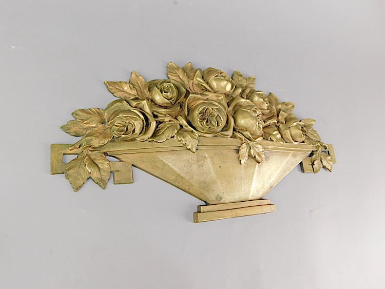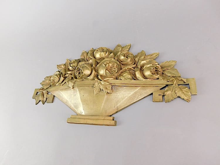 Large stylised art deco gilt bronze flower basket, probably removed from a piece of furniture. Signed J. (Jean) Rabient to one end.
