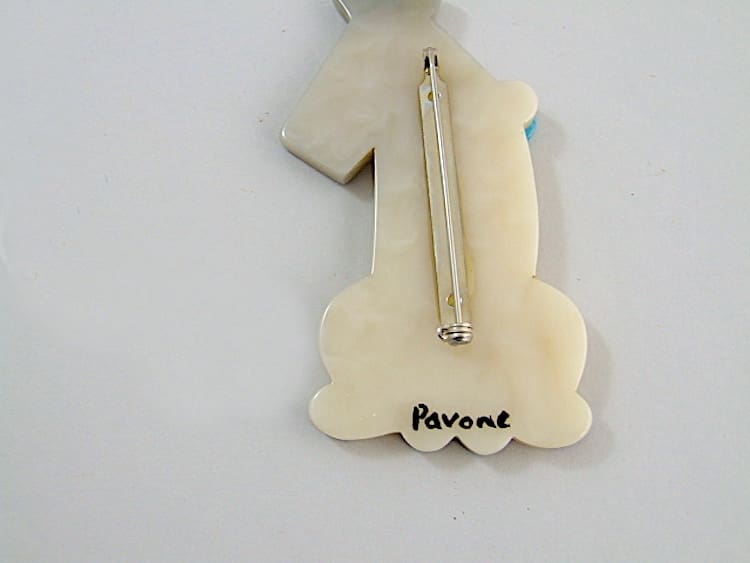 Vintage galalith brooch by Marie-Christine Pavone, hand painted and signed to the back and fitted with a roll safety clasp.