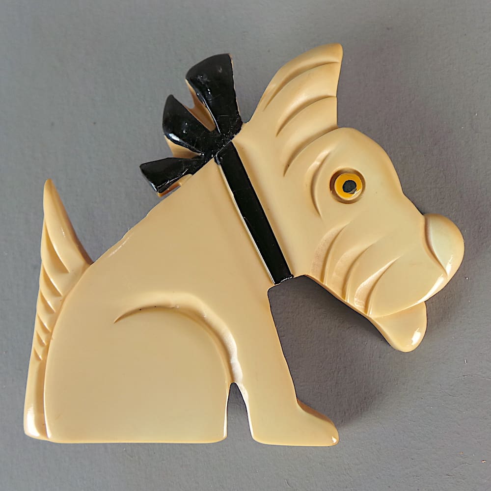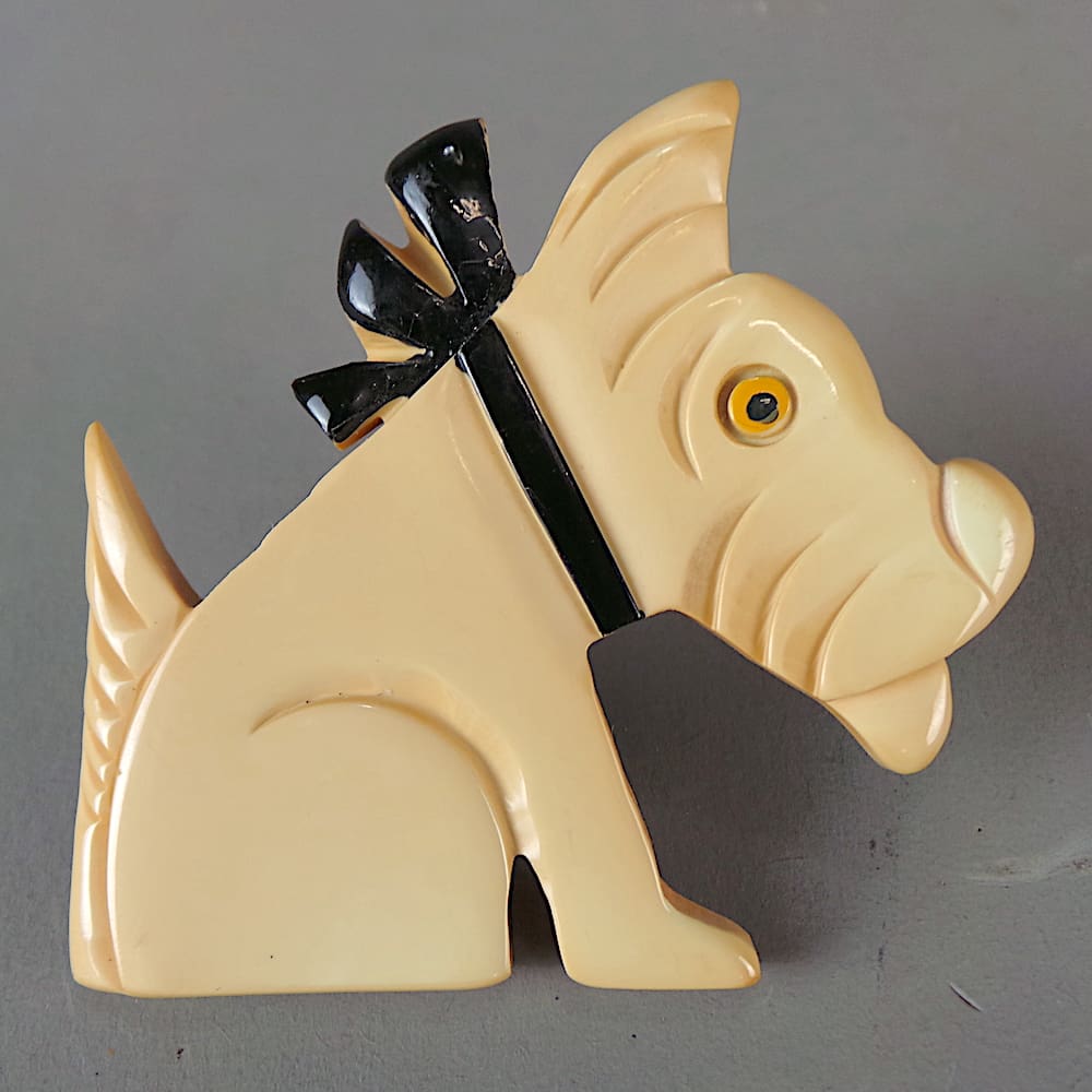 Large French original 1920s cream phenolic Art Deco Rac the terrier brooch.