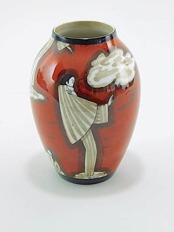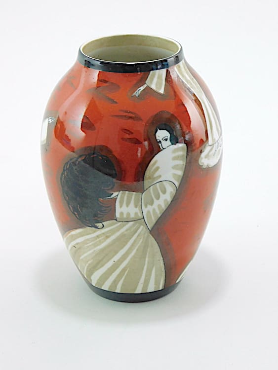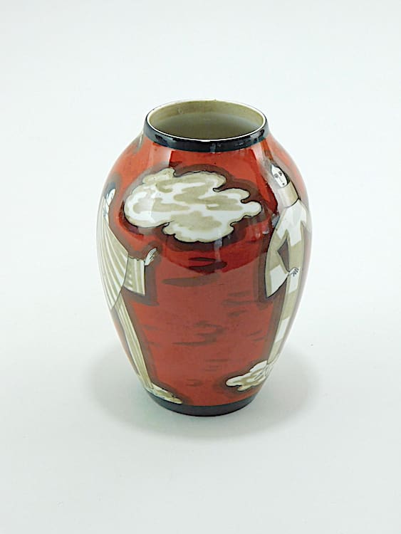 Rare art deco porcelain vase – a famous piece that can be seen in the Art Deco and Modernist Ceramics book. An iconic design by Valentin, they were originally given as a free advertising gift given to rich clients of the women’s wear fur department. Supplied by the La Reine D’Angleterre shop which was on Rue St Honore in Paris in 1925. Signed and stamped under the base. I Bernardaud & Cie, Limoges. It shows 3 different ladies in different fur coats and poses.