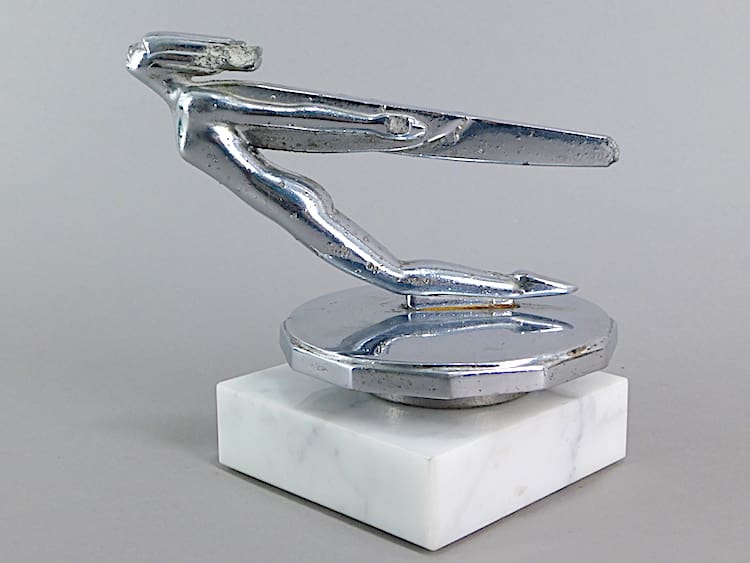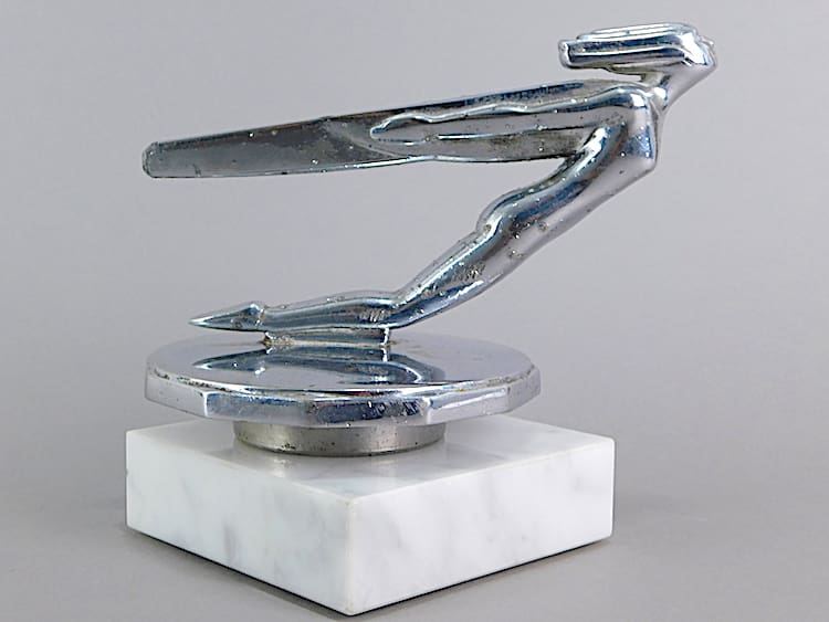 1920’s American Auburn Speedster art deco winged lady car mascot. Mounted on a rad cap and then onto a marble base.