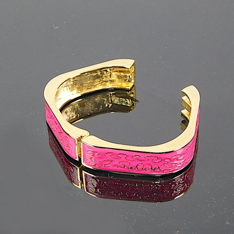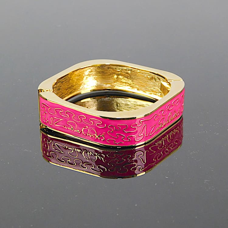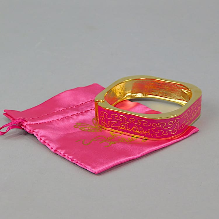 Gold metal wiggle bangle – a signed piece by Zandra Rhodes. Signed in 4 places to the front with pink enamelling panels. It is spring loaded and will fit a small to medium sized wrist. A vintage piece no longer in production. Comes with its original pink ZR pouch.
