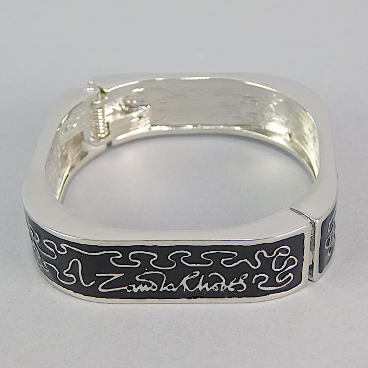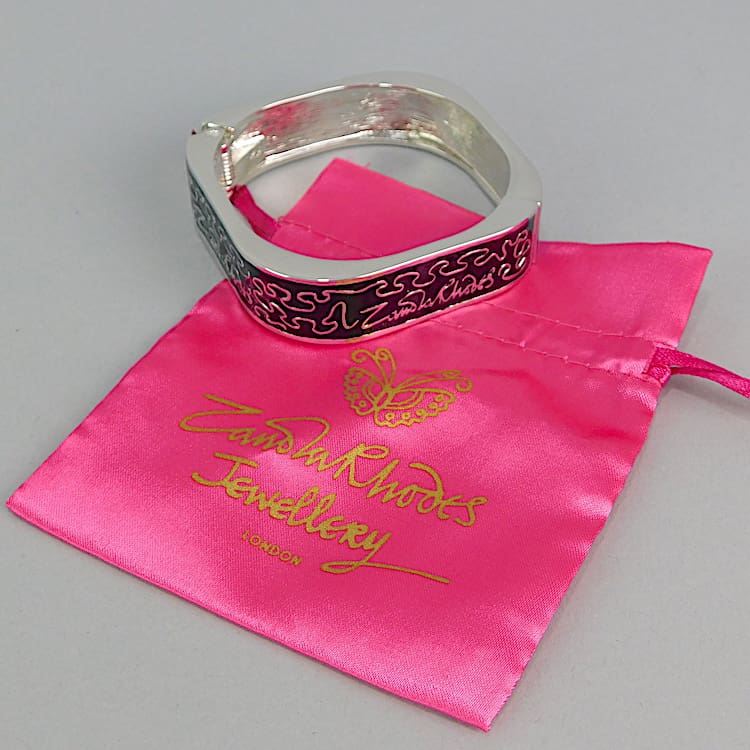 Silvered metal wiggle bangle – a signed piece by Zandra Rhodes. Signed in 4 places to the front with black enamelling panels. It is spring loaded and will fit a small to medium sized wrist. A vintage piece no longer in production. Comes with its original pink ZR pouch.