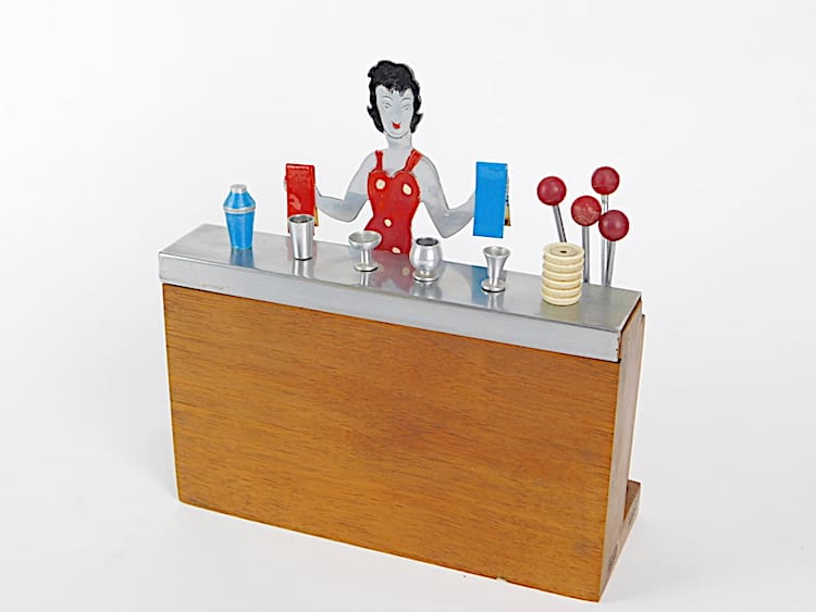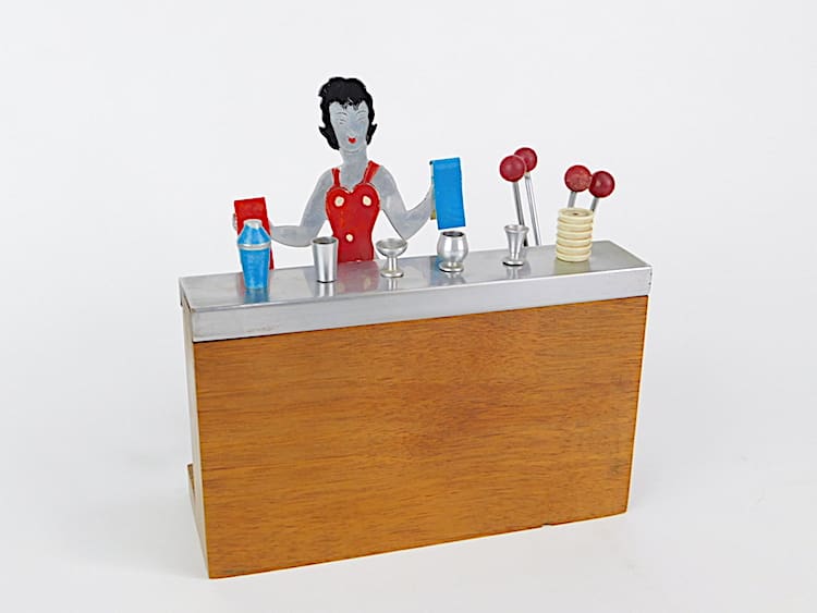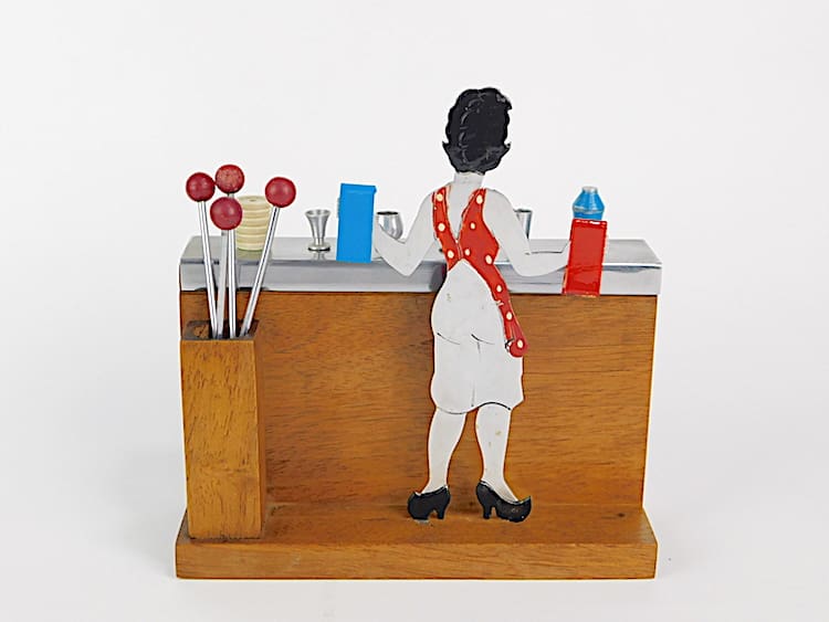 French art deco cigarette box version of this lady at a bar, Usually seen as a glass marker or cocktail sticks lady. She is also holding two glass marker tea towels and there are an additional 4 cocktail sticks with this one. Signed Sudre to the back of her shoe and marked Cado – made in France to the wooden box bar.
