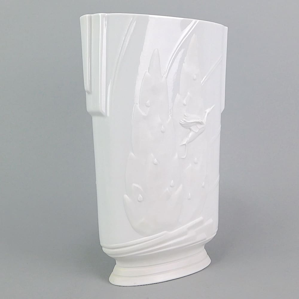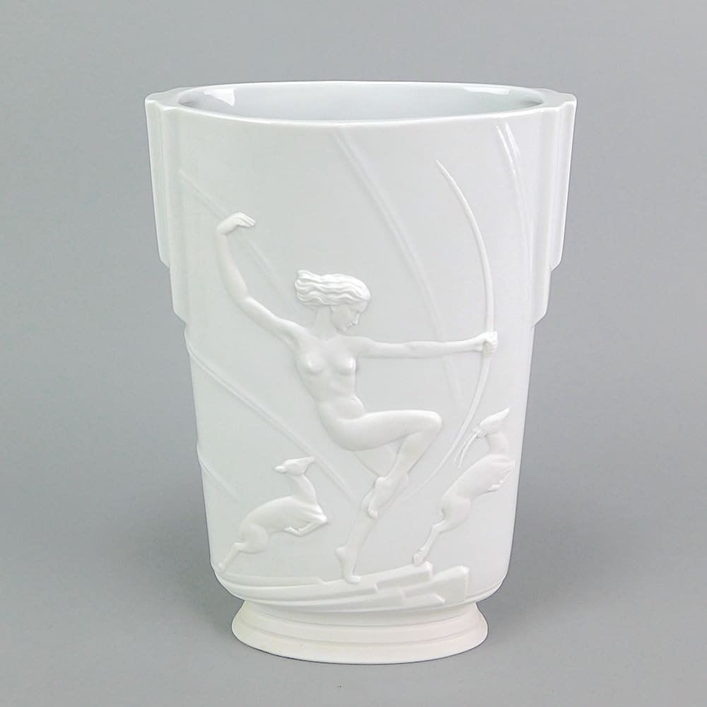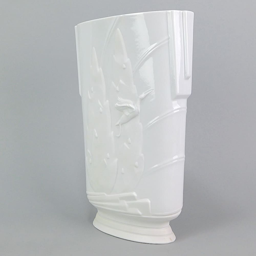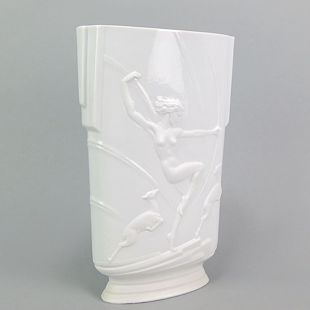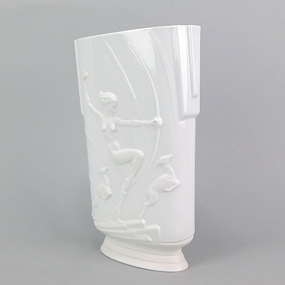 This rare vase is signed Franz to the base with an oriental stamp mark. White ceramic depicting the famous Marcel Bouraine Diane and deer (Statue shown in pictures) to the front panel and a flying bird to the back panel.