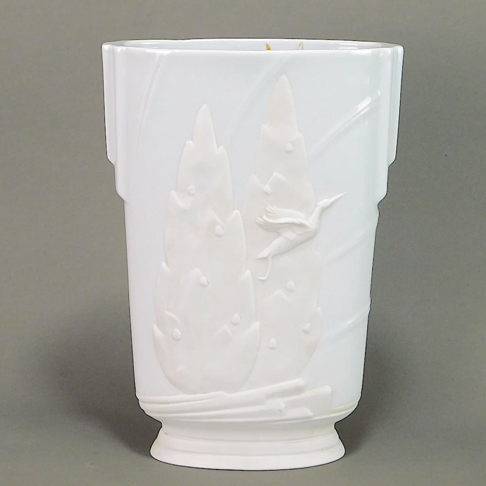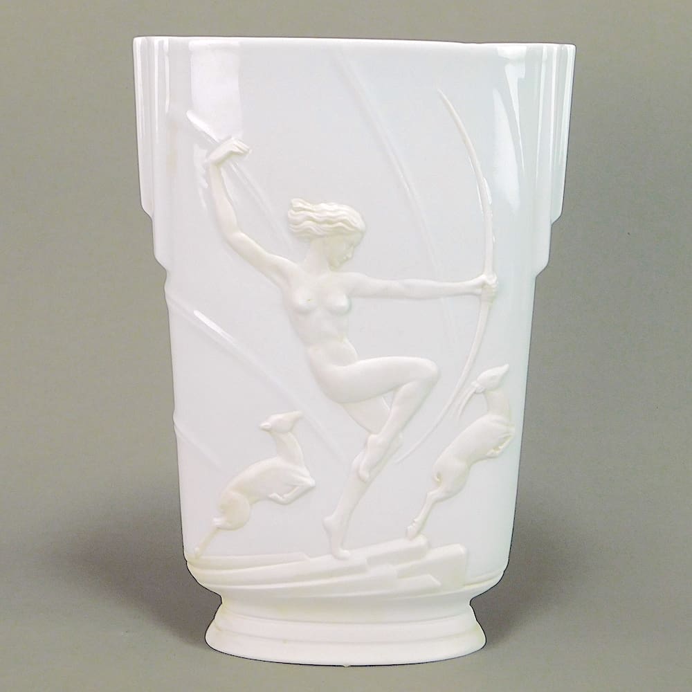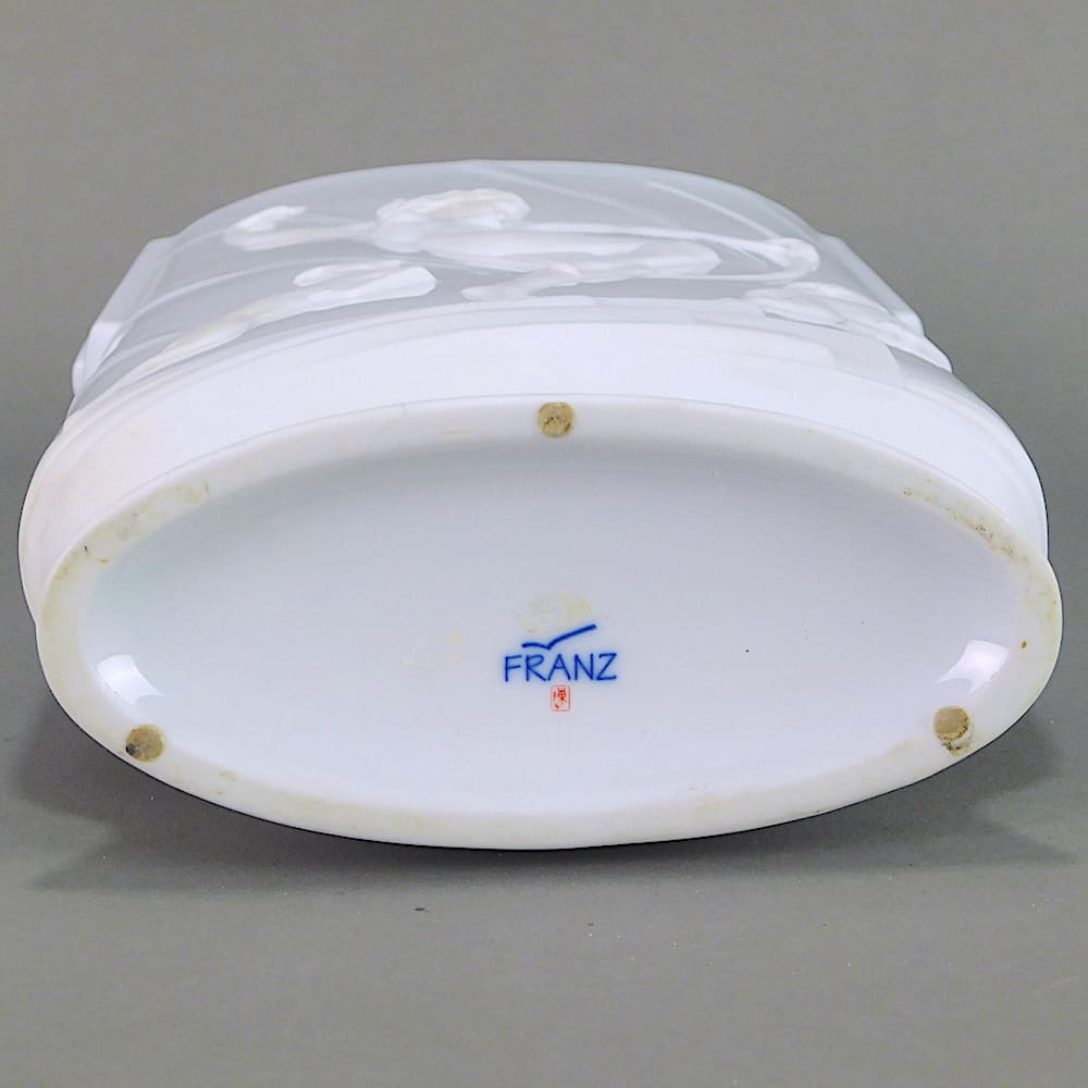 This rare vase is signed Franz to the base with an oriental stamp mark. White ceramic depicting the famous Marcel Bouraine Diane and deer (Statue shown in pictures) to the front panel and a flying bird to the back panel.