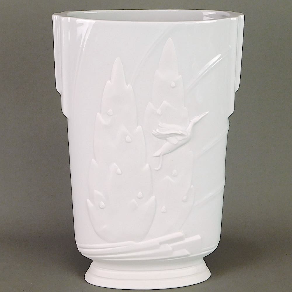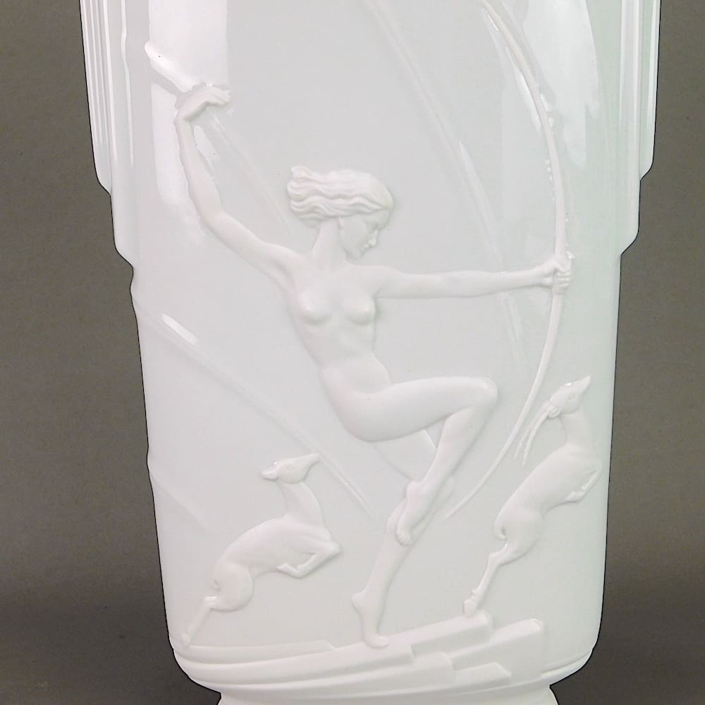 White ceramic depicting the famous Marcel Bouraine Diane and deer (Statue shown in pictures) to the front panel and a flying bird to the back panel.