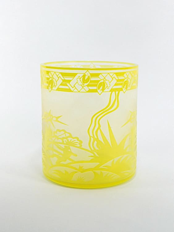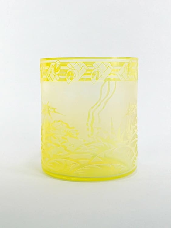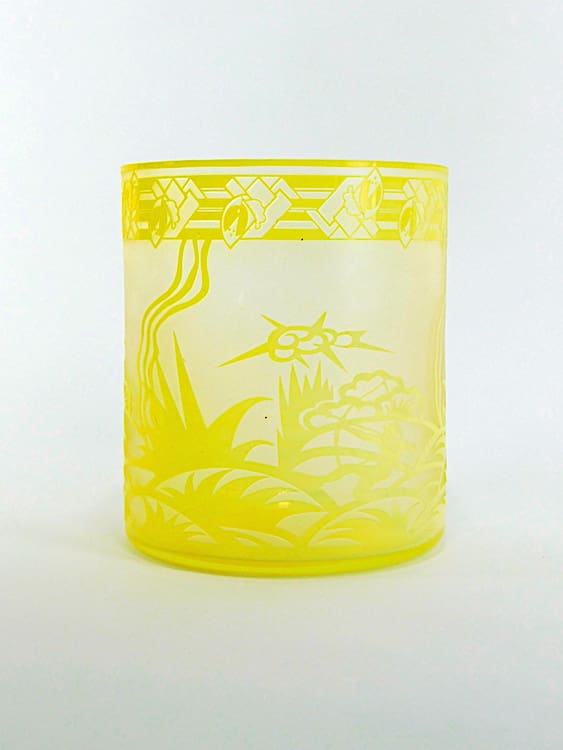 Early 1930’s Czech yellow acid etched vase with male archer patterning. Unsigned but either Zelezny Brod or Novy Bok.