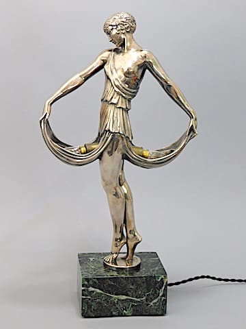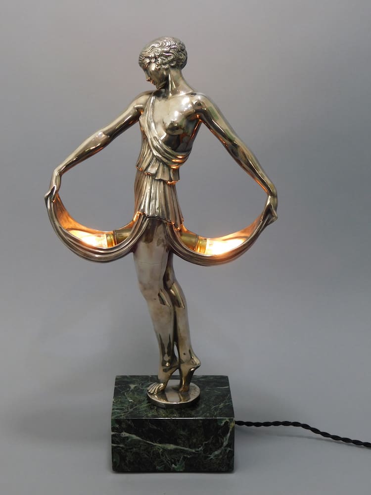 French art deco chromed art metal lady lamp (missing glass shades). This is a rare version of the Harmony statue as a lamp. Harmony was designed by Pierre Le Faguays and signed in his pseudonym – Fayral. Produced by the Le Verrier foundry.