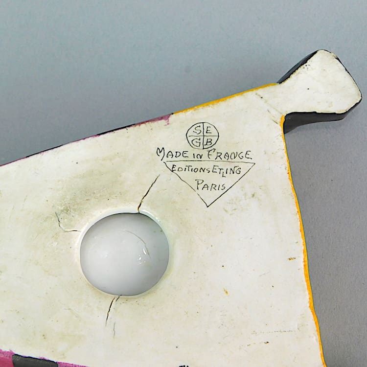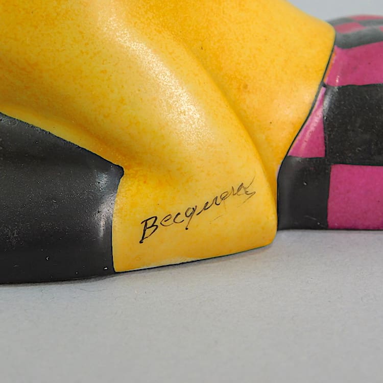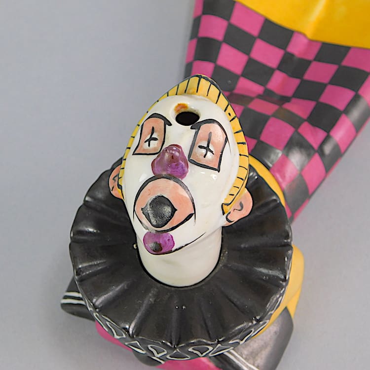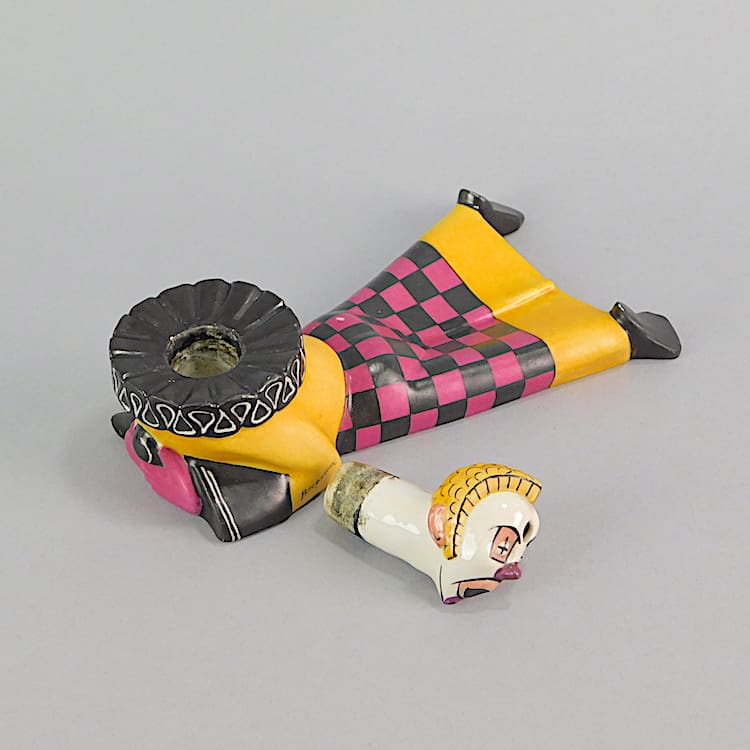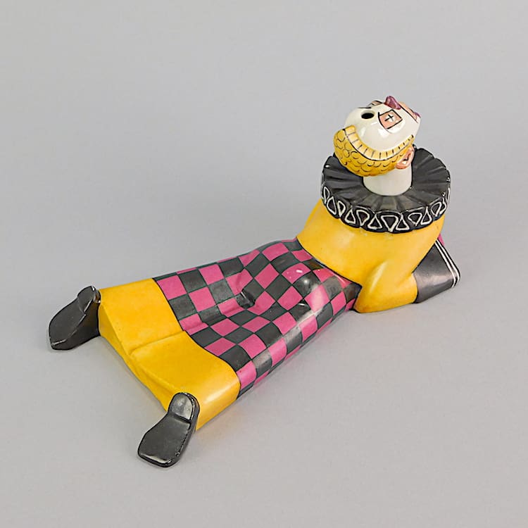 Rare French hand painted ceramic ink pot clown desk ornament. A signed piece by Becquerel, signed to his arm and under the base it is stamped with the Made in France Etling foundry stamp. In excellent condition with just 2 small firing cracks under the base near the air hole which is there from new and not unusual. The head comes out o reveal the ink well pot. And there is a pen hole in his head. He measures 8.25 inches (21cm) long x 4.5 inches (11.5cm) deep x 4.5 inches (11.5cm) high. A very rare inkwell – I have never seen another the same.