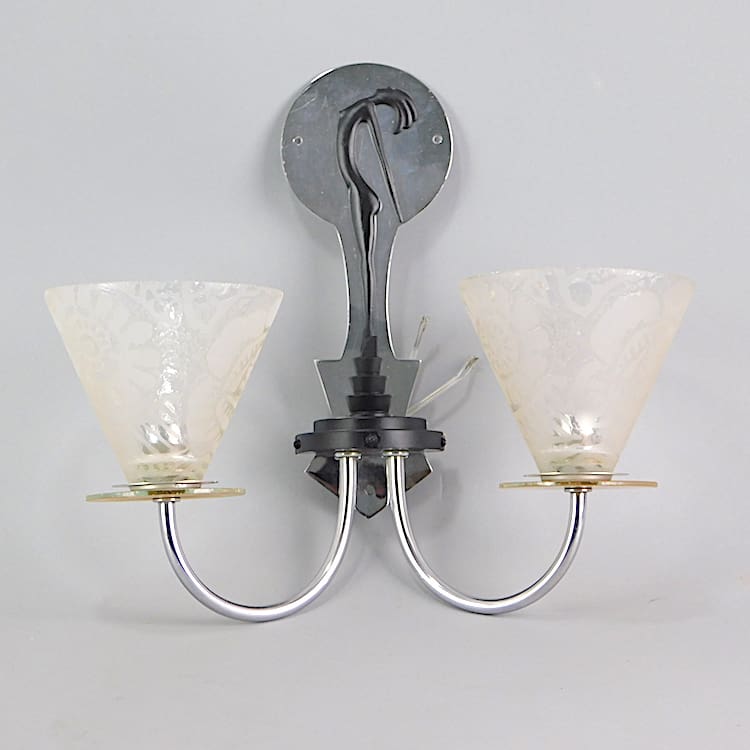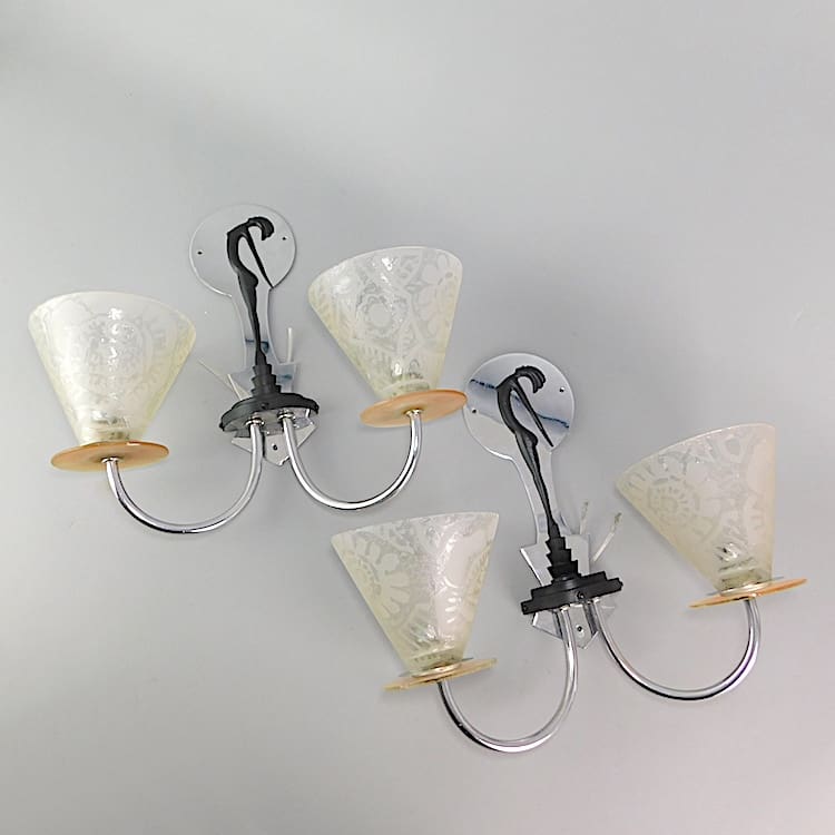 English GEC wall lights – designed by Hagenauer for the light company. I have seen several ceiling lamps with this same dancing stylised statue on them but never before seen wall lights. I have a matching ceiling lamp to this pair and a 2nd pair of the wall lights both are available separately. They each have chrome back panels with a Black silhouette lady on them – standing on a stepped base. To each arm is a frosted glass Saturn ring and 2 large clear shades.