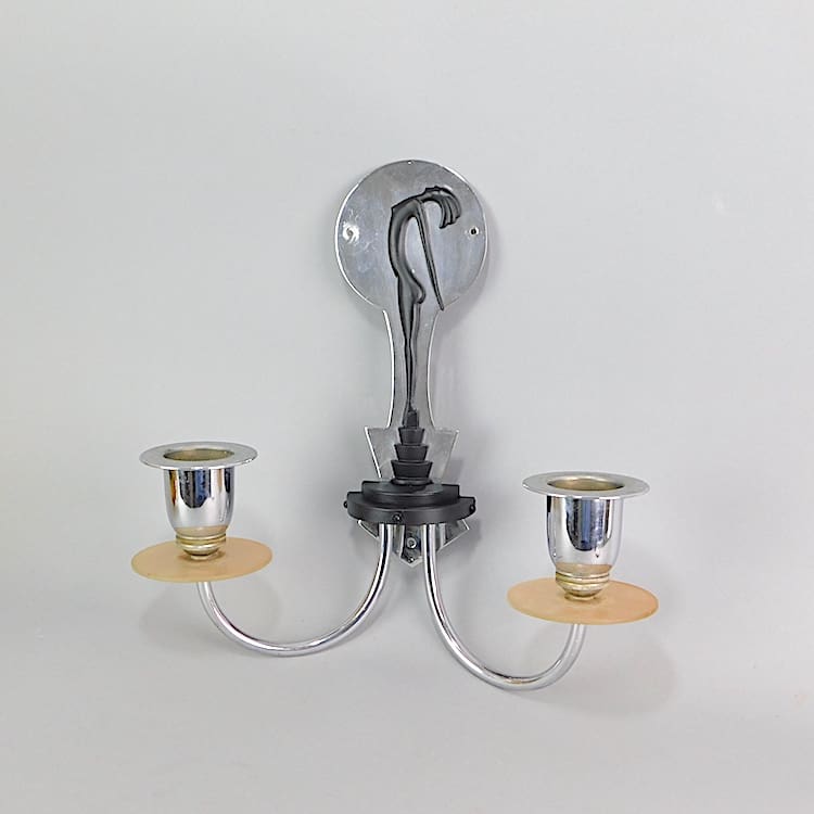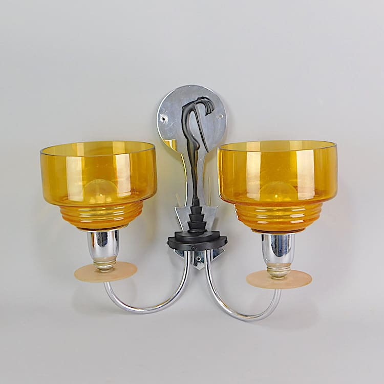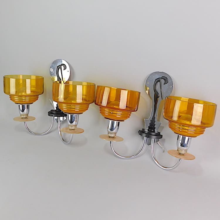 English GEC wall lights – designed by Hagenauer for the light company. I have seen several ceiling lamps with this same dancing stylised statue on them but never before seen wall lights. I have a matching ceiling lamp to this pair and a 2nd pair of the wall lights both are available separately. They each have chrome back panels with a cream silhouette lady on them – standing on a stepped base. To each arm is a frosted glass Saturn ring. They each have 2 large original amber glass dish shades.