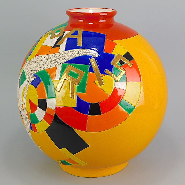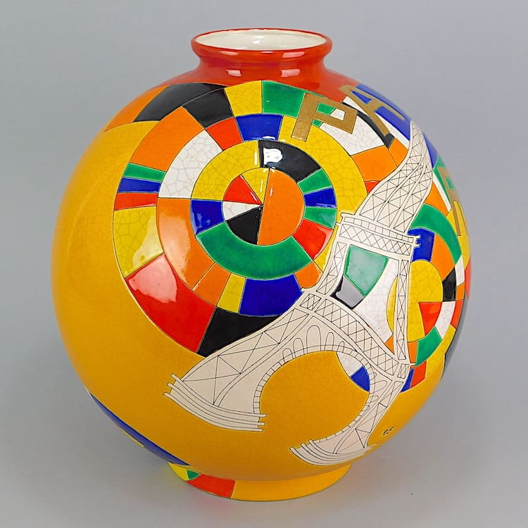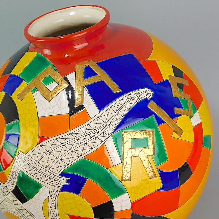 These Large ball vases are highly sought after and command very high prices as they are hand made and painted and frequently include silver or gold leaf detail and this does in its lettering which reads “Paris”.