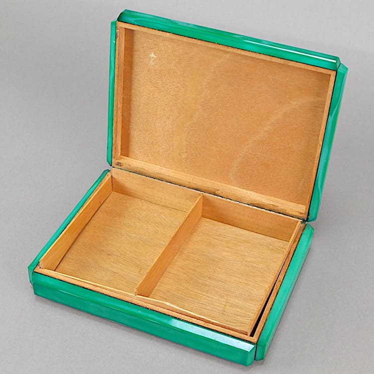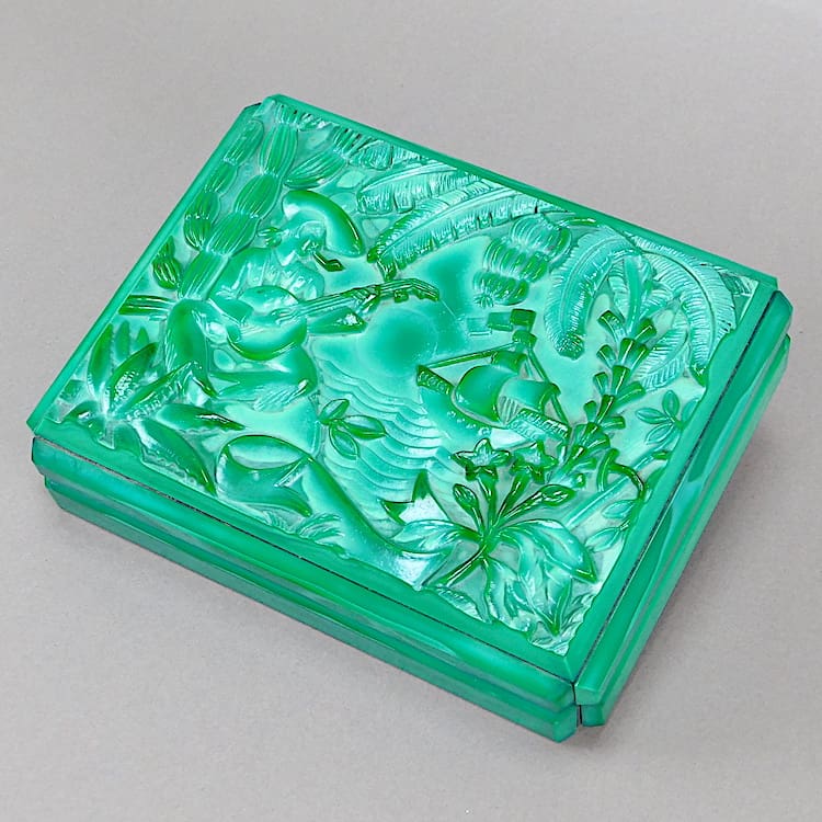 A Czech malachite glass cigarette box, c1935, malachite glass depicts a man wearing a sombrero playing a ukulele with a ship in the background and with tropical flora in the foreground.