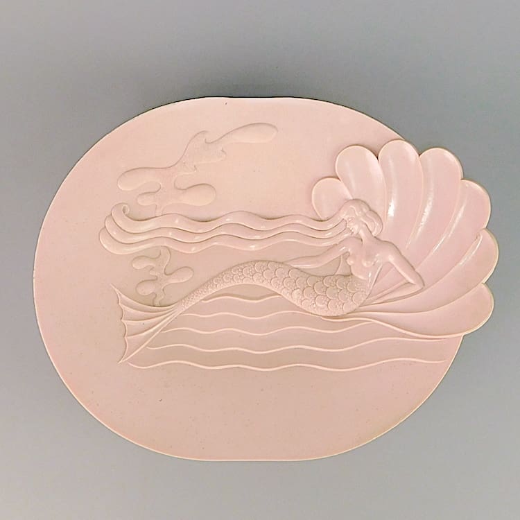 To the fronts is a stylised mermaid sitting on waves in a clamshell, she has very long wavy hair and there is seaweed detail.