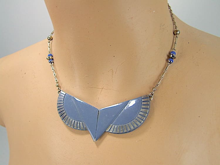 French Art Deco necklace with blue galalith panels highlighted in silver. Made by Augustus Bonaz in the 1920s.
