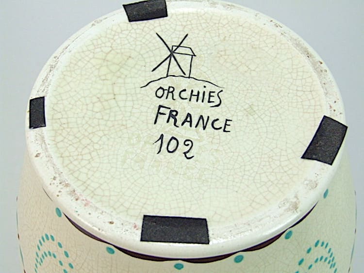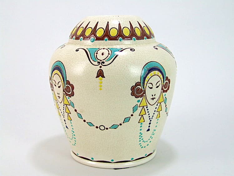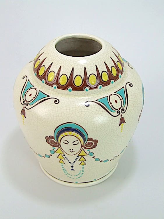 French art deco faience crackleglaze enamelled vase with hand painted art deco oriental flappers (x4) around the outside with other hand painted detail. Marked with the early Orchies signature to the base.