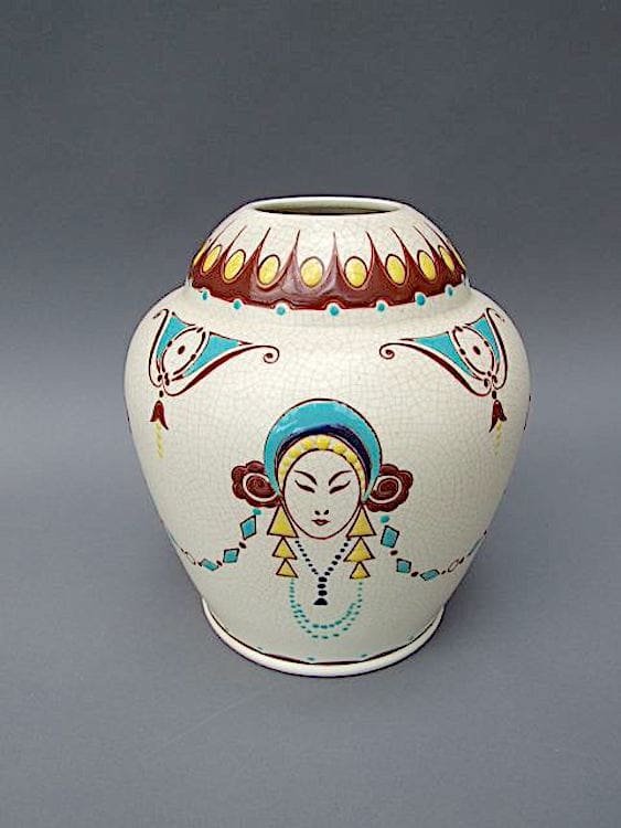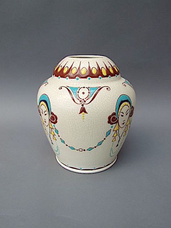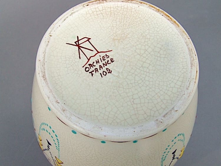 French faience crackleglaze enamelled vase with hand painted flappers (x4) around the outside with other hand painted detail. Marked with the early Orchies signature to the base.