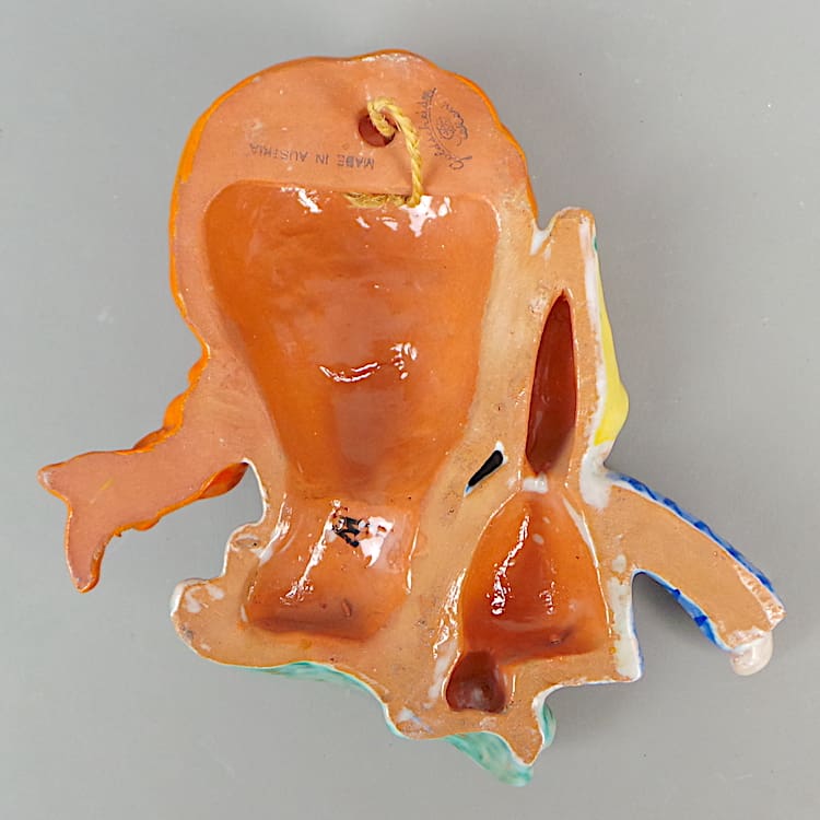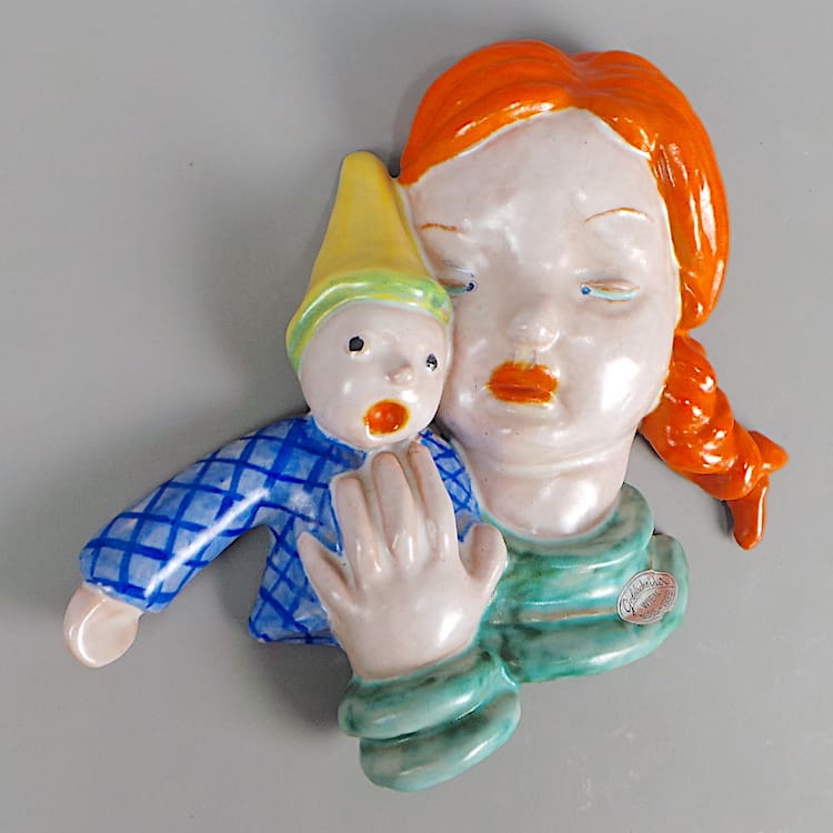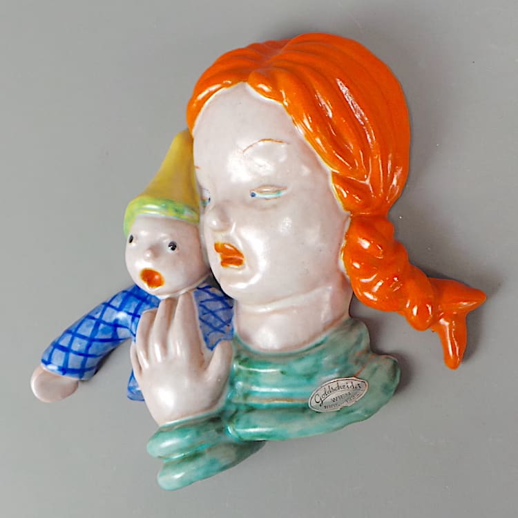 Extremely rare art deco hand painted terracotta girl and Pinocchio doll wall mask.