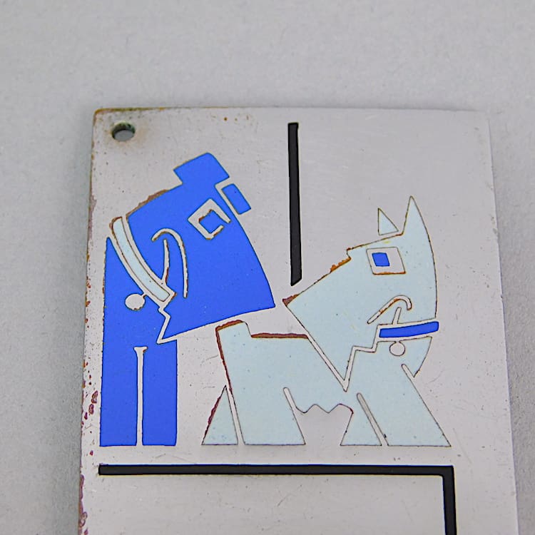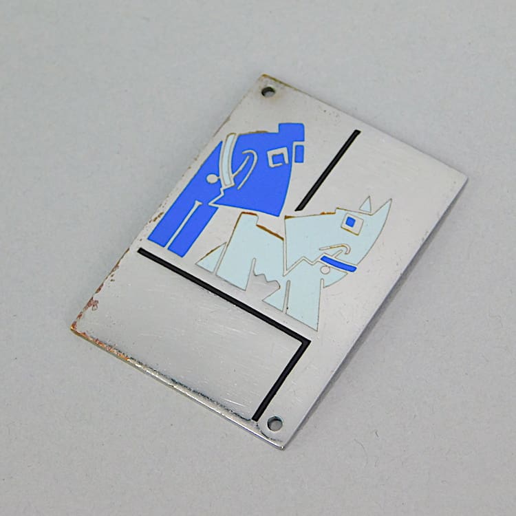 1920s French car dashboard plaque with an enamel Ric and Rac (Pol Rab) dogs picture in enamel. I believe these were made to personalise your car dashboard by having your name engraved on them. There are pin holes to screw it to the dashboard. This is an old unused and unsold plaque.