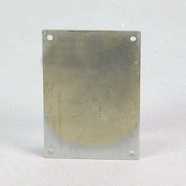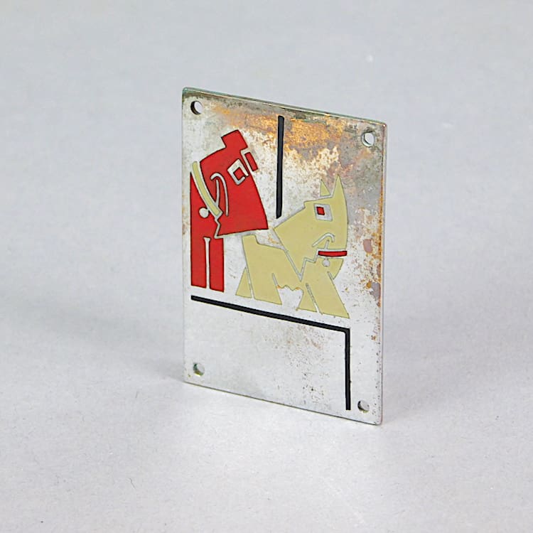 1920s French car dashboard plaque with an enamel Ric and Rac (Pol Rab) dogs picture in enamel. I believe these were made to personalise your car dashboard by having your name engraved on them. There are pin holes to screw it to the dashboard. This is an old unused and unsold plaque with age tarnishing to the top right hand corner.