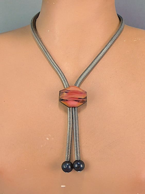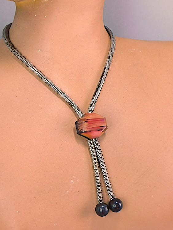Made in the early 1930s by Jakob Bengel this snake chain has a rare galalith candy striped lucite panel. The panel slides up and down the chain to a length to suite the wearer.
