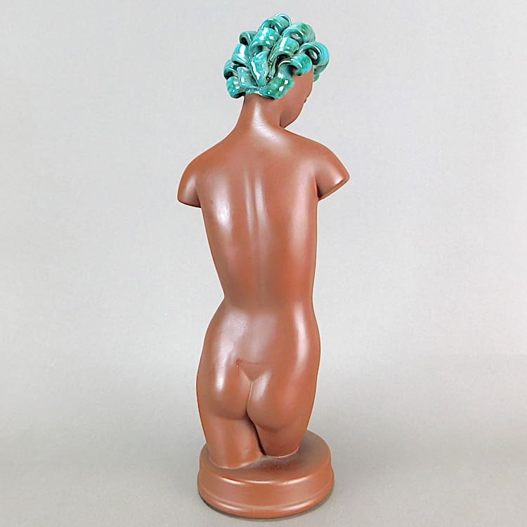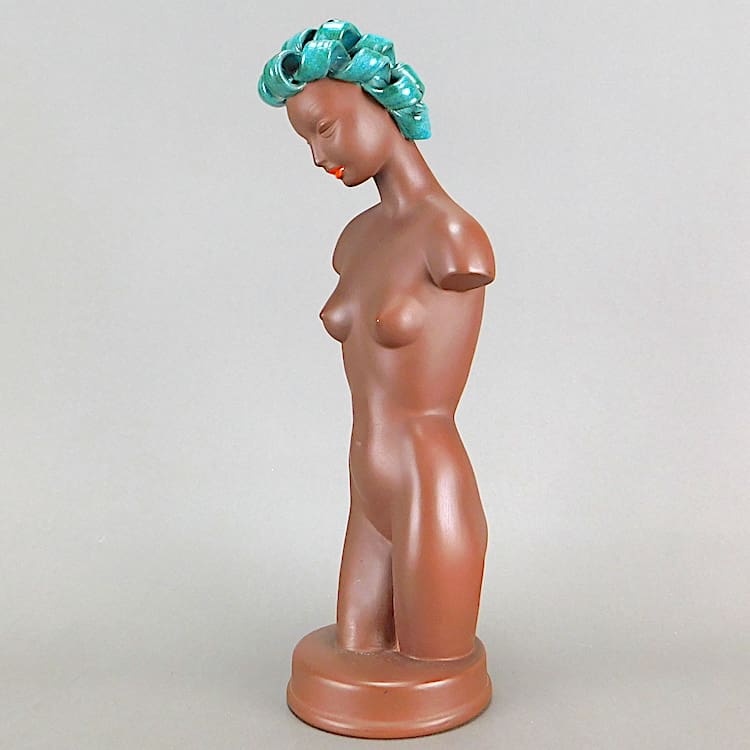 She has a matt terracotta glaze with orange painted triple sausage hair detail in true Goldscheider design.