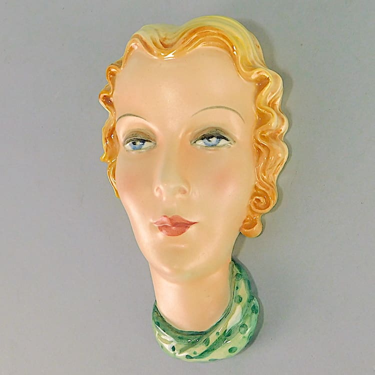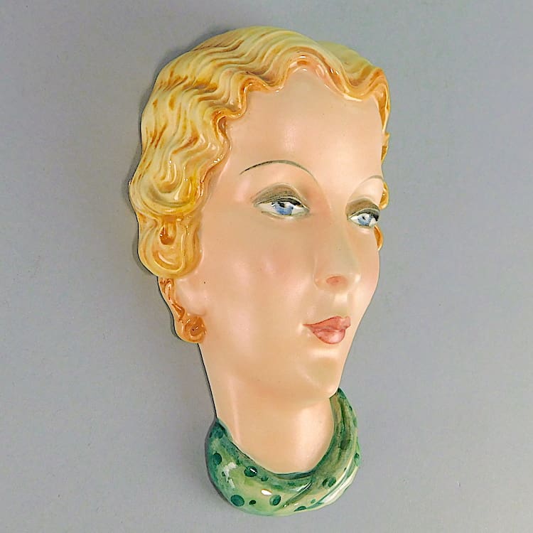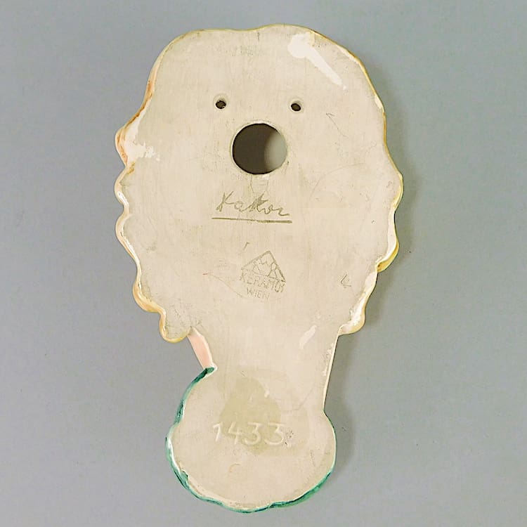 Small hand painted ceramic wall mask made by the kerimos company and indistinctly signed to the reverse Dakon.