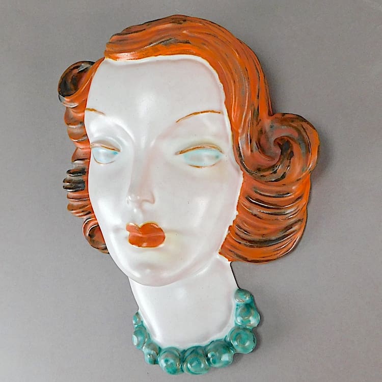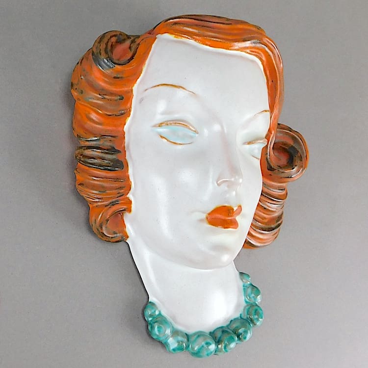 Hand painted art deco Austrian wall mask by Goldscheider of a lady wearing a pearl necklace.