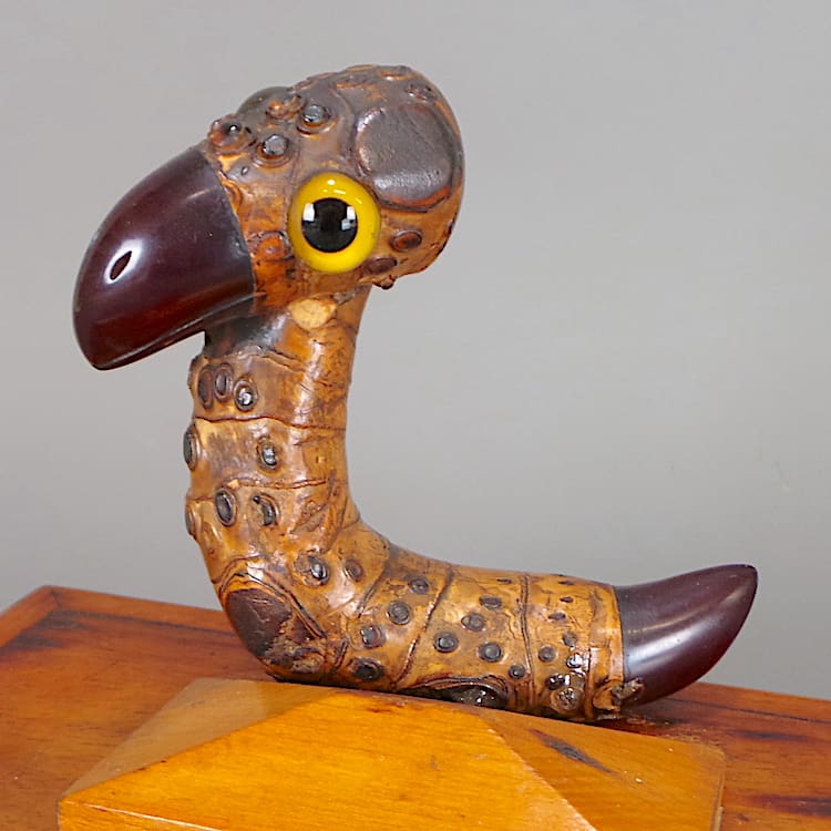 He has a red phenolic beak and tail and glass eyes in typical YZ style.